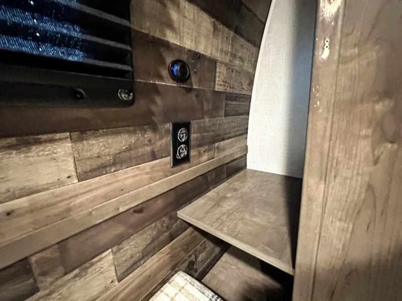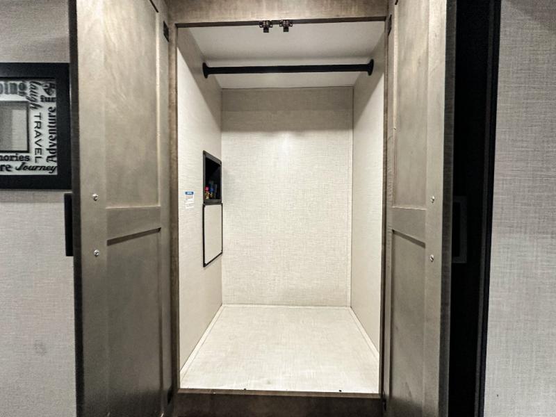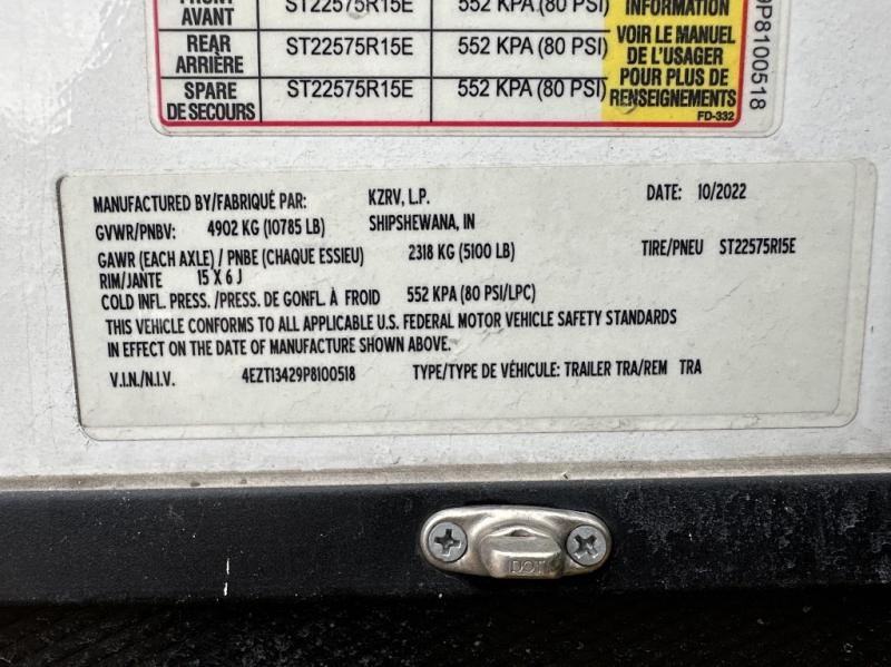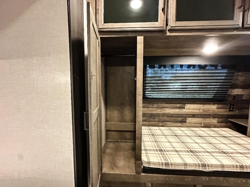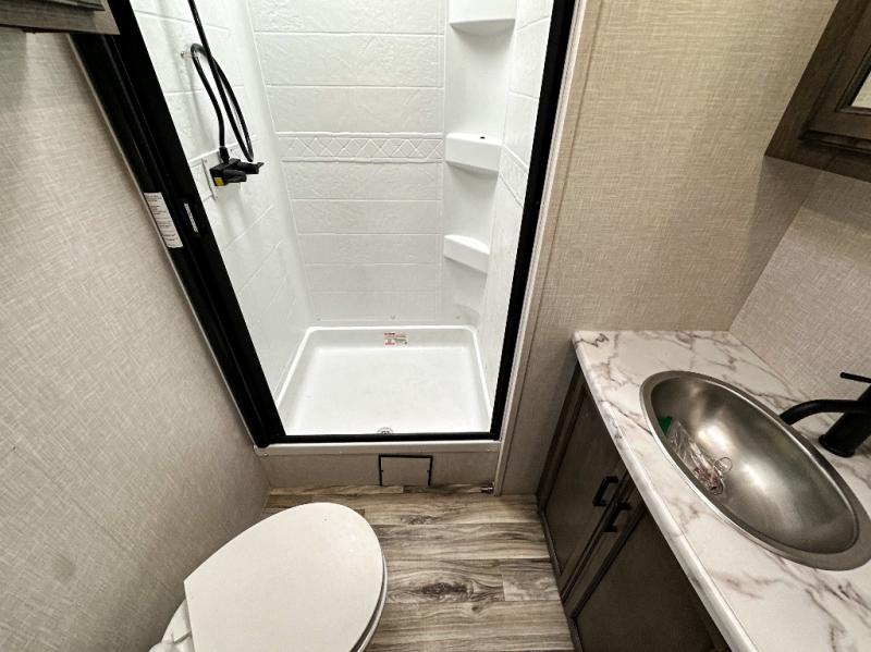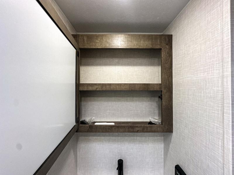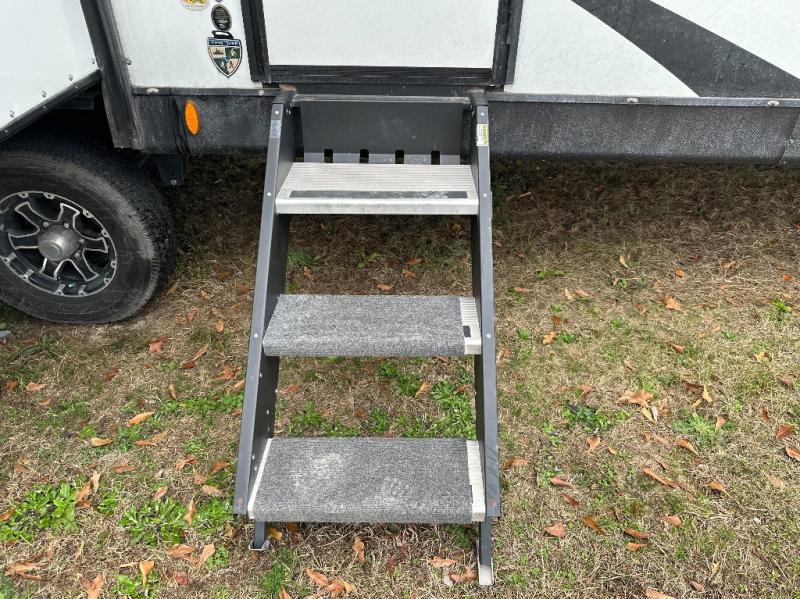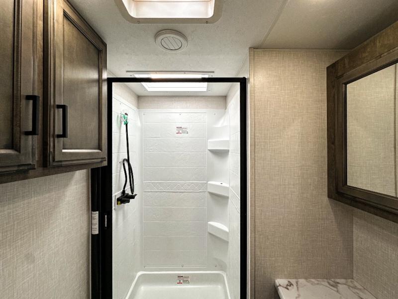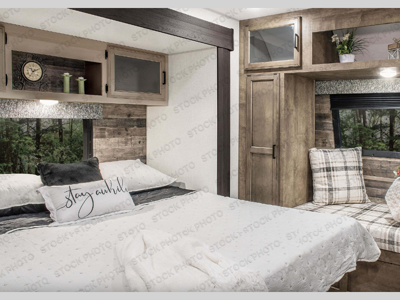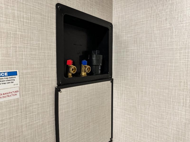 Pack your bags and hitch up this travel trailer for a great weekend camping trip! The front private bedroom has a 70" x 80" Sleep Tight king bed slide to lay your head at night, a dresser with a 30" frameless fireplace, a window seat with shelves on either side for your books, and a wardrobe with washer and dryer prep. Freshen up each morning in the full bathroom with the 30" x 36" shower then head to the kitchen to fry up some eggs on the three burner cooktop and pour a cold glass of orange juice stored in the 10 cu. ft. refrigerator. The kitchen island will make your meal prepping easier and the table and chairs offer a comfortable place to enjoy your meals or play card games. You could even cook your meals at the exterior campfire café and set up a table underneath one of the two power awnings!