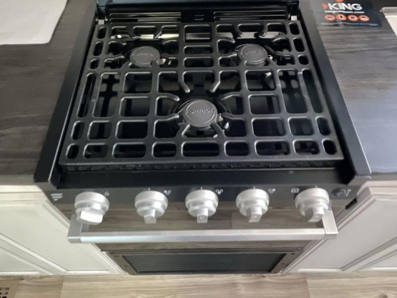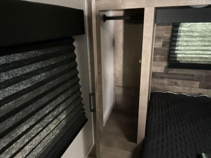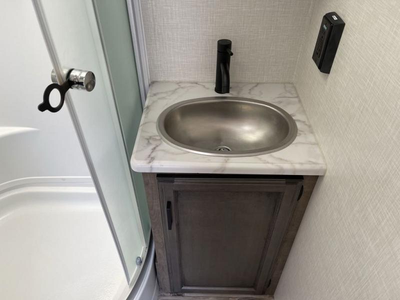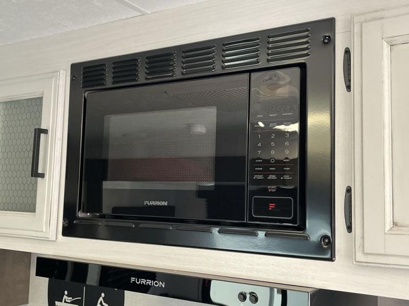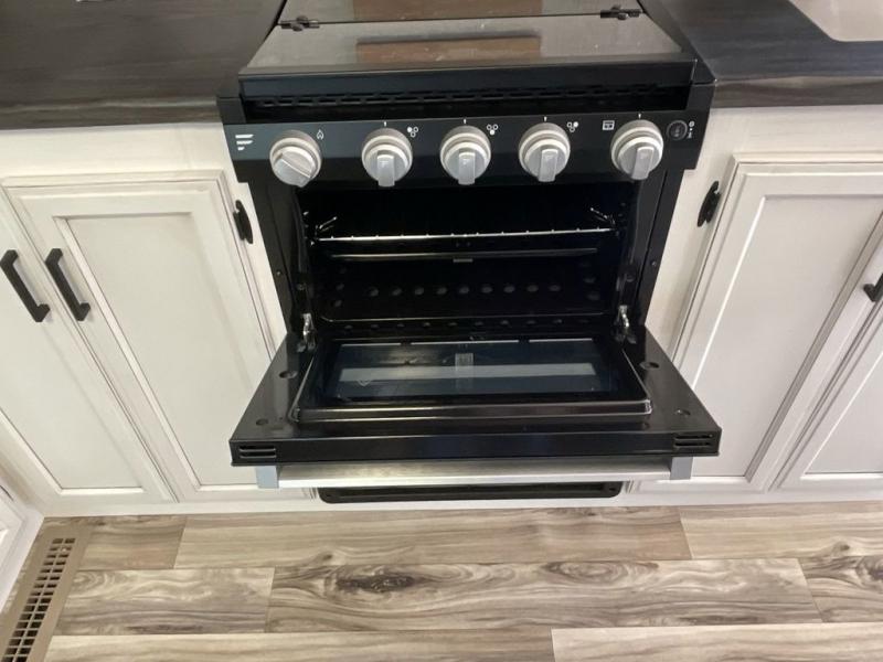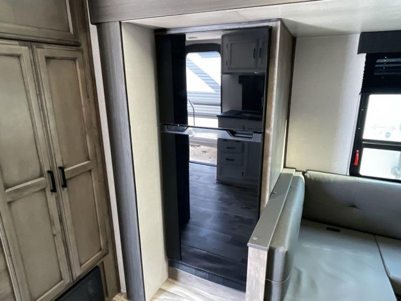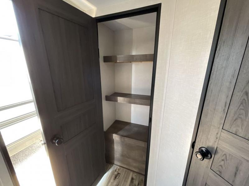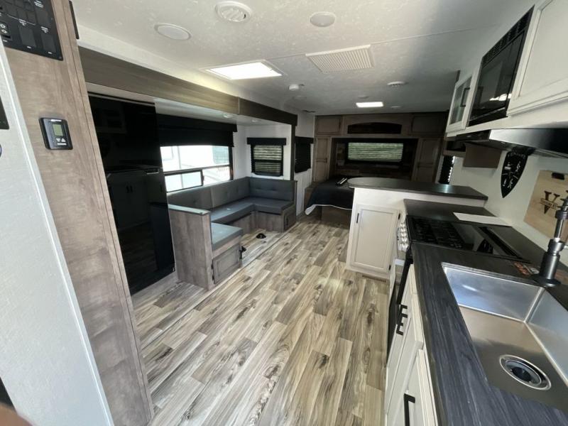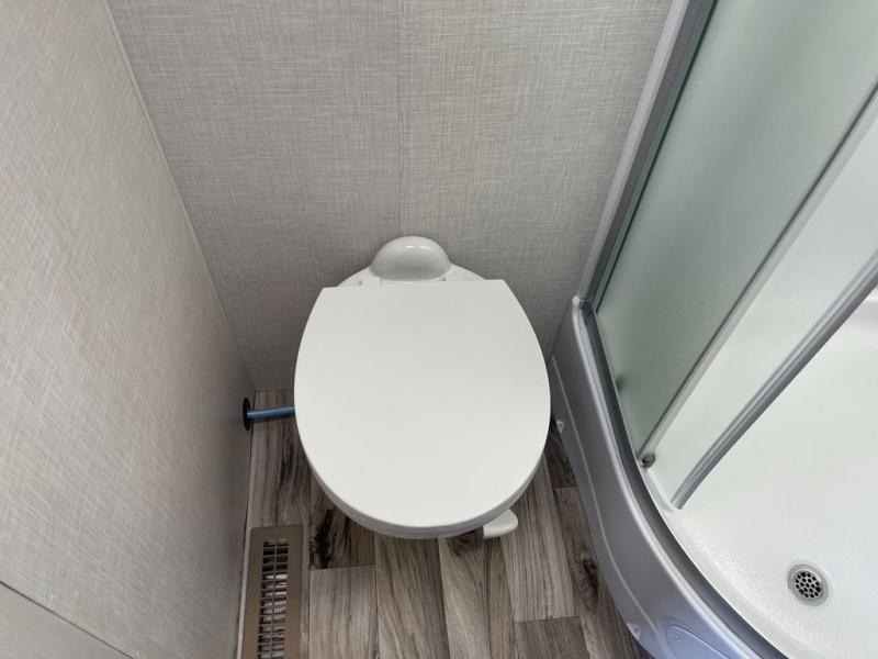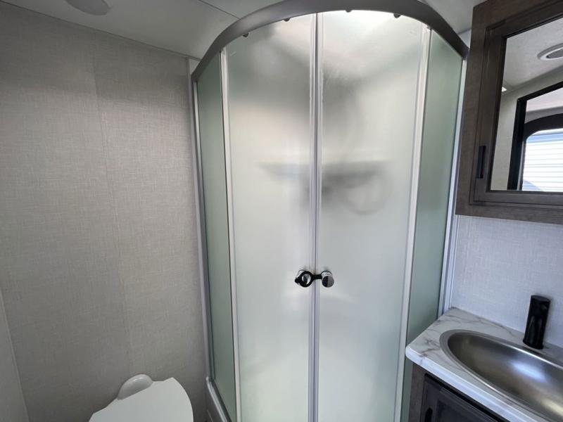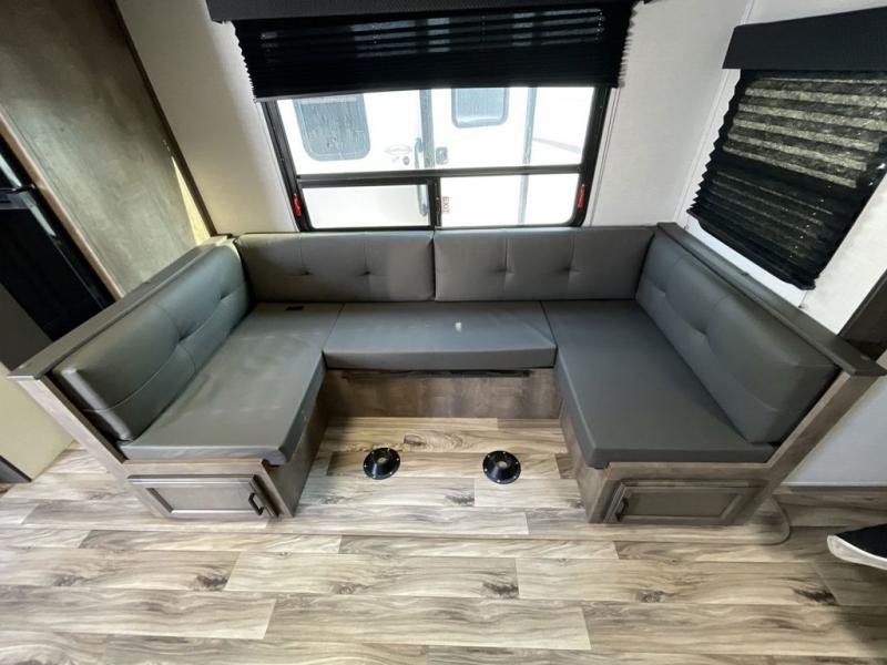 This travel trailer is perfect for two people who wish to escape the hustle and bustle of everyday life! You will enjoy a good night's rest on the sleep tight queen bed with shelves and wardrobes on either side to hang your clothes, and if you want an extra guest or two to tag along then you can transform the 88" x 42" U-shaped dinette into an extra sleeping space. Everyone will stay clean with a rear corner bathroom that has a 34" radius shower. Grab your dry goods from the walk-in pantry, your perishables from the 10 cu. ft. refrigerator, and cook them all on the three burner cooktop with Furrion oven. The bar top with two bar stools is the perfect place to enjoy your morning coffee and eggs!