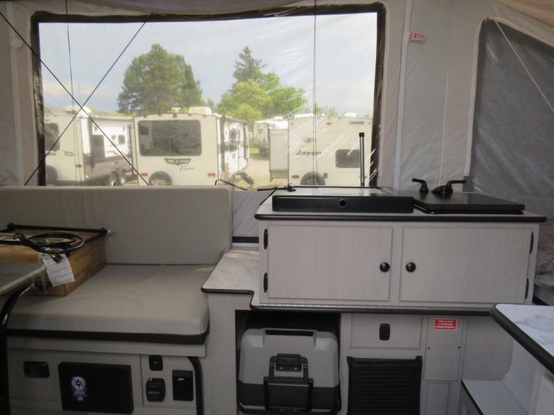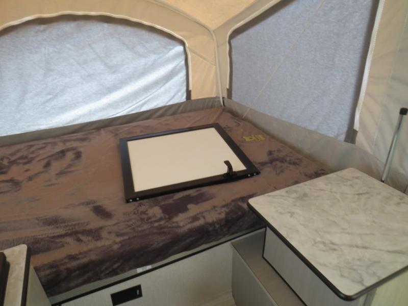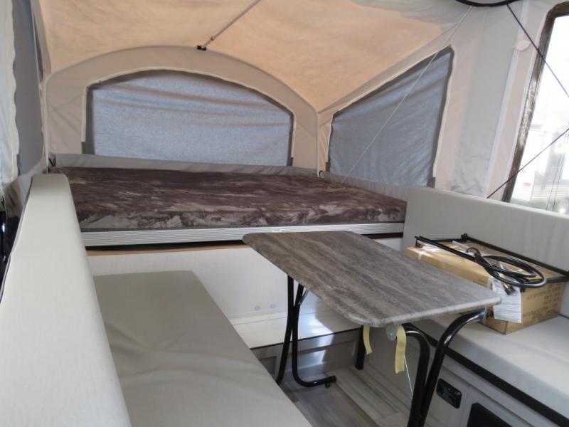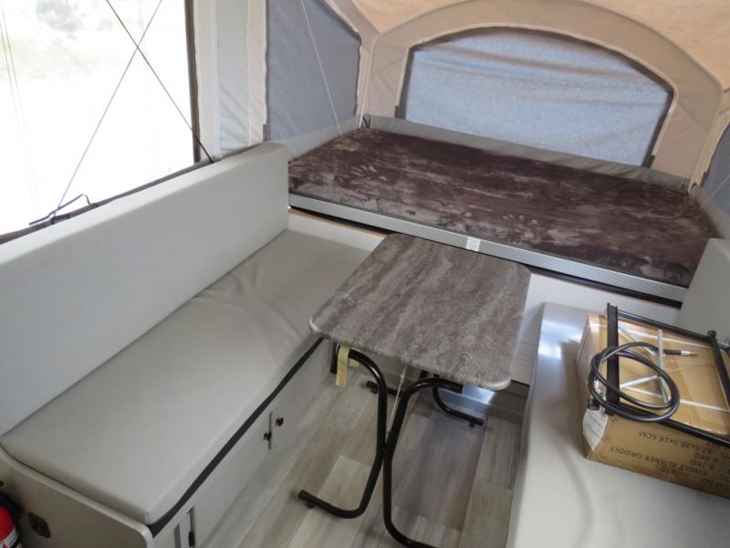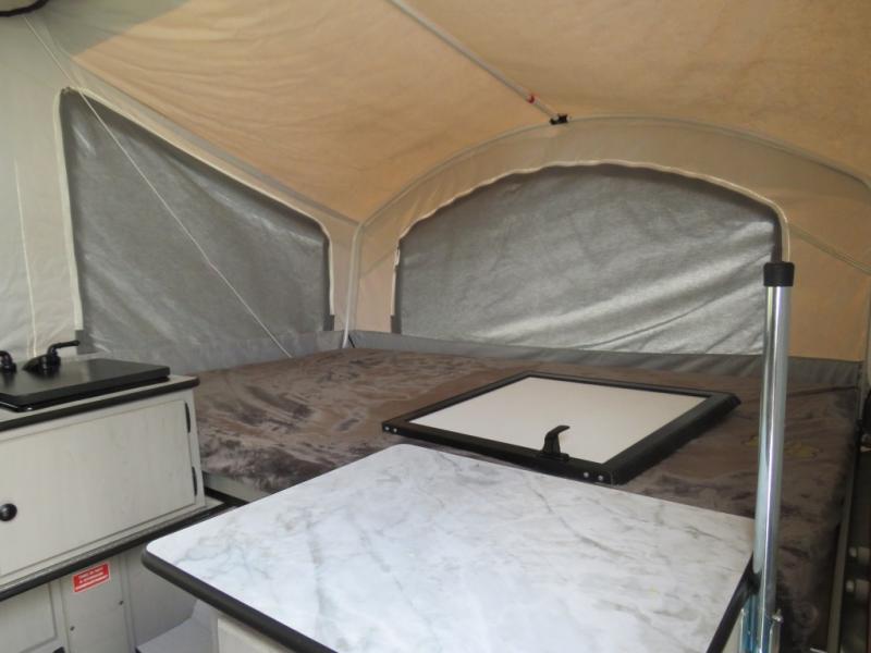 Head to your favorite spot with your favorite people in this folding pop-up camper! There are two insulated tent end beds with Glide-N-Lock cable supported, one is 48" and the other is 54", to lay your head on at night. Plus two opposing 60" gaucho sofas with ultra comfort 4" high density cushions that can convert into an extra sleeping space. You can prepare your best home cooked meals with the two burner high output range and keep your perishables fresh with the 120watt/12V refrigerator/freezer cooler. The exterior awning will protect you rain or shine!