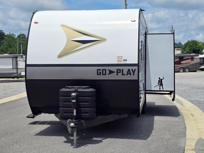 The affordable Go Play travel trailers by Wayfinder RV are ready to meet your camping needs! You will appreciate the durable Magnum Roof system, plus each model is constructed with black front diamond plate protection, 5/8" main floor decking, and self-adjusting electric brakes with E-Z Lube axles for smooth towing. The 81" interior height means you won't feel cramped when relaxing with friends and family, and the residential vinyl flooring throughout is easy to clean, which will be perfect if you're camping with little ones or pets. These models also include an AM/FM/Bluetooth radio with indoor/outdoor speakers, a digital TV antenna, plus a 13,500 BTU roof mounted A/C to keep you cool on those hot summer months.