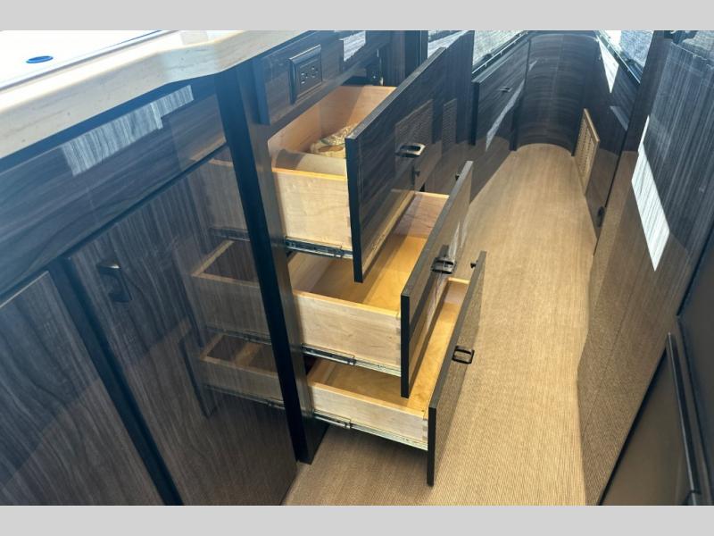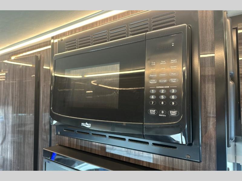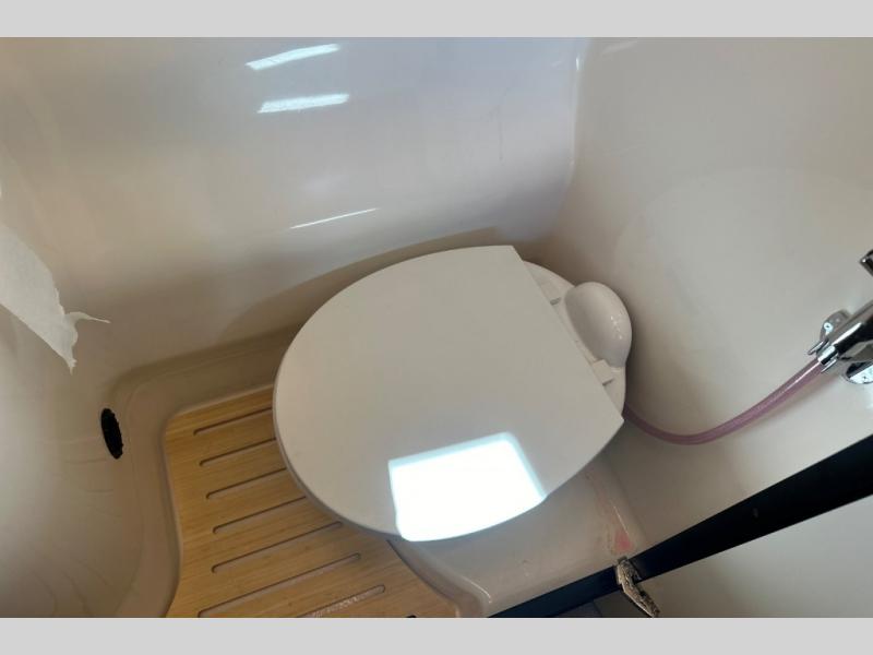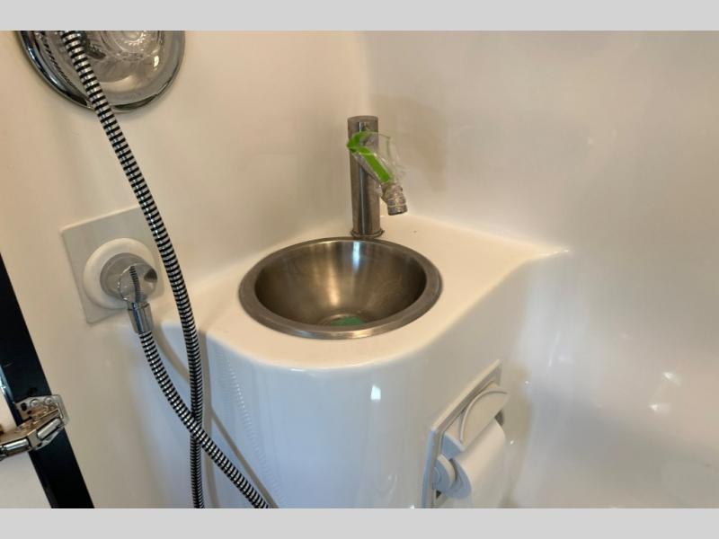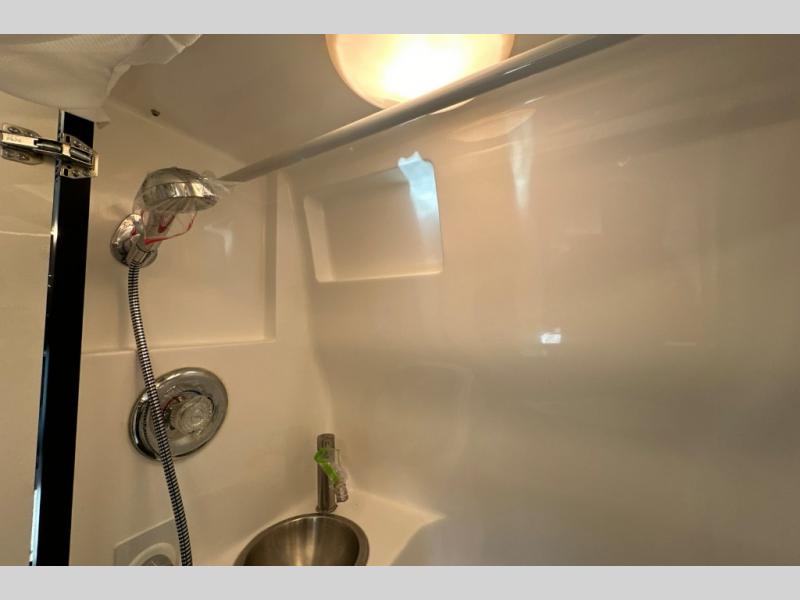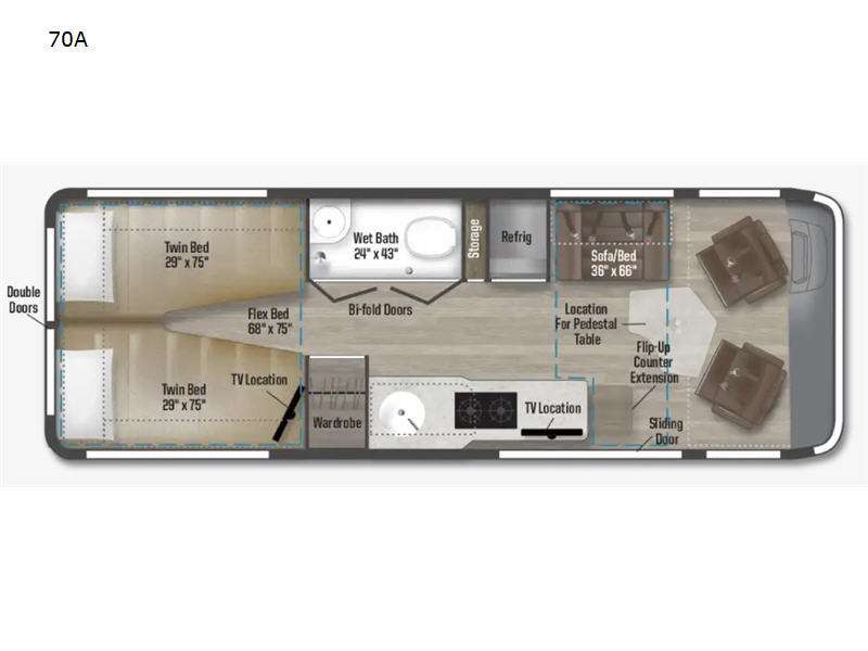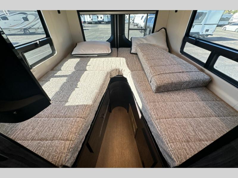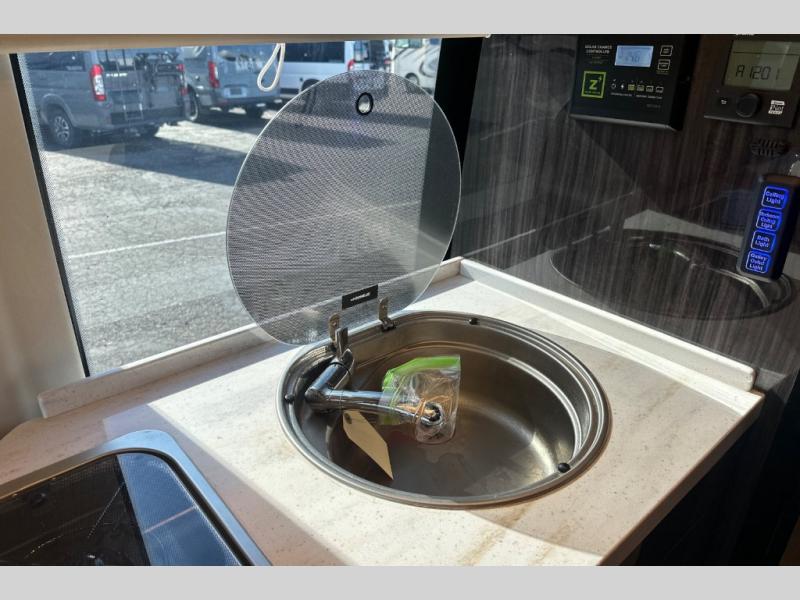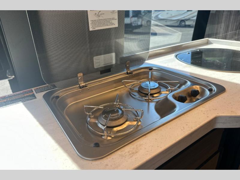 Adventure awaits you in this stylish motorhome that can sleep three people each night. There are twin beds at the back that can convert to a 68" x 75" Flex bed and a 36" x 66" sofa bed up front for a guests or two small children. Once you arrive at your destination, prepare a quick meal on the two burner range that includes a glass cover if you're needing the counter space. You will also have the flip-up counter extension to prep meals on as well. The wet bath is conveniently tucked away behind bi-fold doors, and here you'll find a flexible showerhead, a stainless steel bath sink, plus a powered roof vent to keep everything fresh. This model also includes plenty of storage spaces, including a wardrobe and a slide out compartment tray that can be accessed from the rear door.
