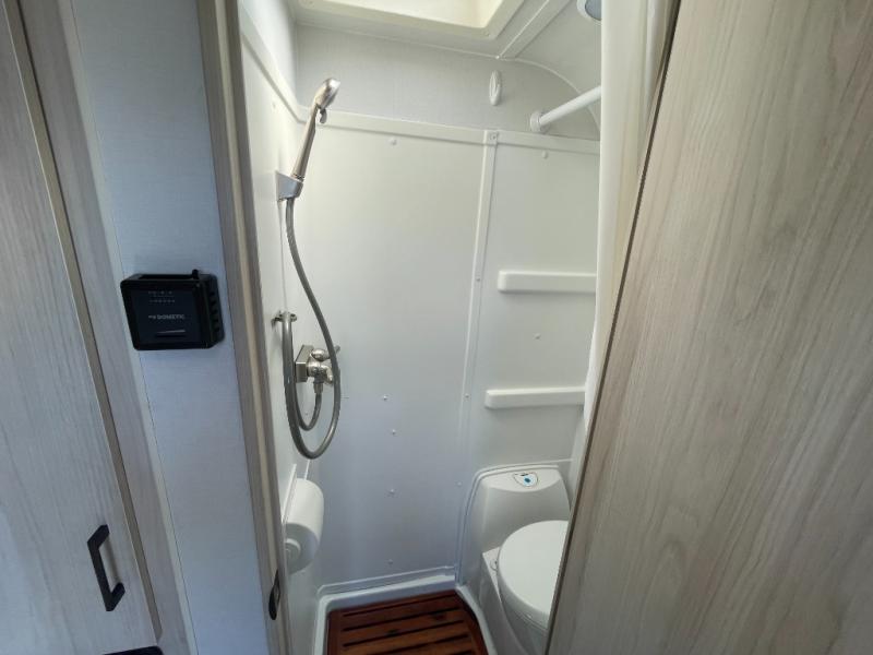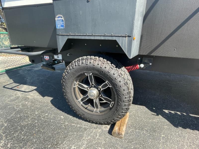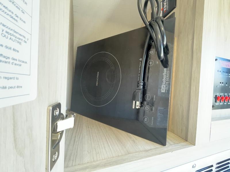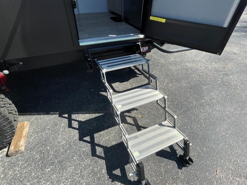 If you love to explore the great outdoors during the day and enjoy creature comforts at night, this trailer is for you! The 29 1/2" x 41" rear bike door allows you to quickly stow your bikes or other camping items inside that you want to protect. The front kitchen amenities include a portable induction cooktop, an undermount single bowl sink with a cover, a convection microwave, and a 3.1 AC/DC compressor refrigerator. You can eat while sitting on the folding bench seats with a folding table before falling asleep on the twin bunk beds. And there is a wardrobe for your clothes, and a wet bath for convenience.