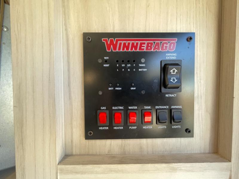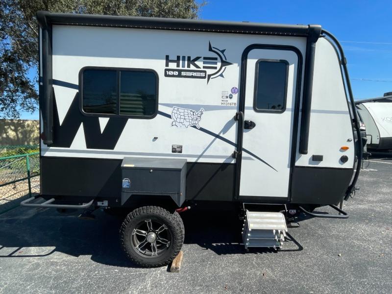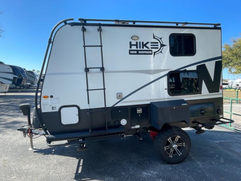 The Hike 100 travel trailers by Winnebago Industries Towables are the outdoor enthusiasts dream RV! It's light enough to be towed by smaller tow vehicles, but still includes plenty of space for your gear. Each model is constructed with one-piece thermo-foil insulation, an NXG engineered frame, a fully enclosed underbelly and tanks, plus a fully walkable roof. You will love the 200-watt solar panel with side-mount solar prep for your off-grid needs, and the patented powder coated exterior exoskeleton rack will be perfect for kayaks, hiking gear, or paddleboards. There are also thick core pass-through storage doors outside, along with a power awning with LED lights, plus power stabilizer jacks and a power tongue jack to be set up in no-time! The interior features contemporary cabinetry, USB ports to charge your electronics, additional gear storage, plus a portable JBL speaker to listen to your favorite tunes at the campsite.