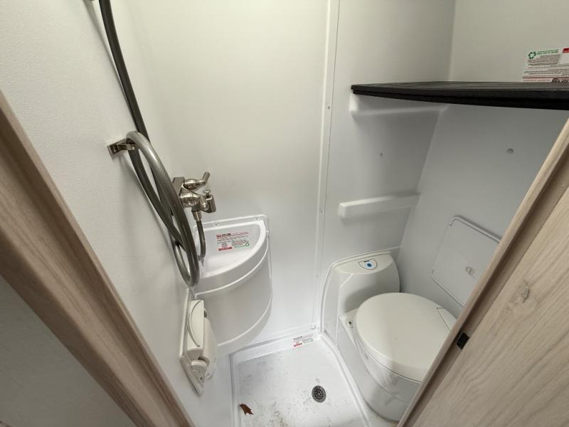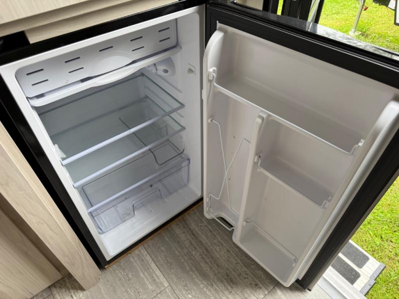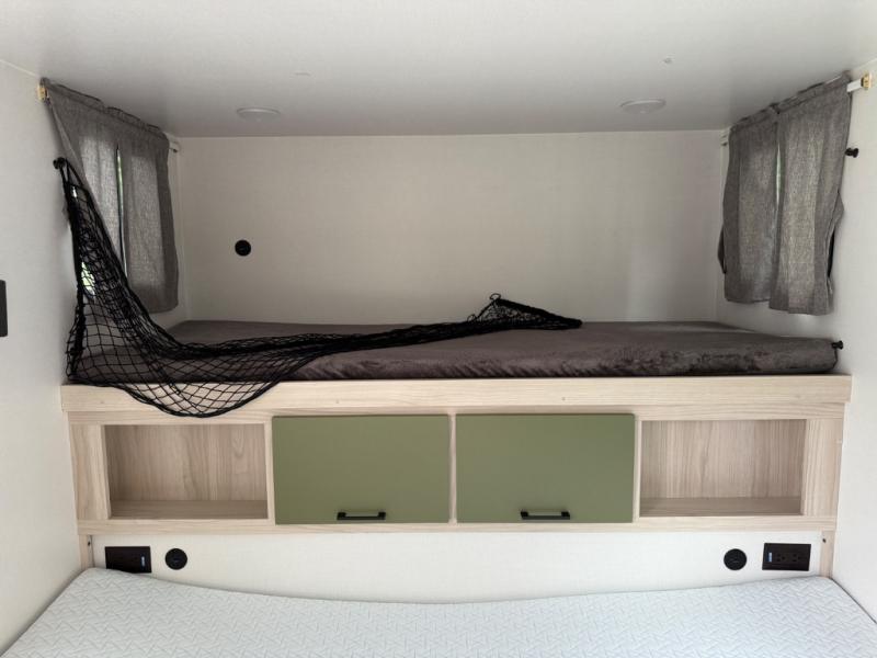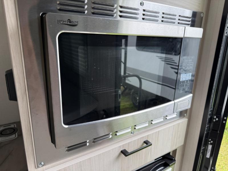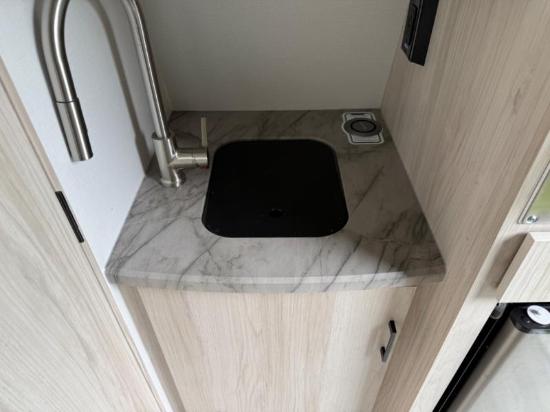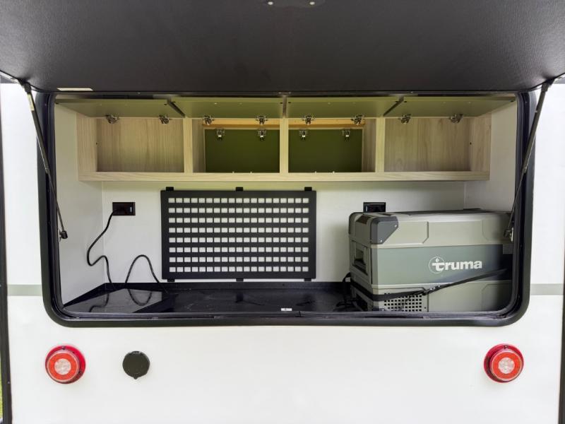 Explorers will love this trailer with the comfortable accommodations inside and rugged amenities outside. You can sleep on the east/west queen bed and a friend or family member can sleep on the loft bunk bed above. There is a wardrobe to store your clothing that is next to the wet bath which provides privacy to change and get cleaned up in after hiking or sitting by the campfire. The portable induction cooktop can be used inside or take it to the outside kitchen counter space to whip up a meal while enjoying your views, and there is a portable Truma cooler waiting for you to grab a beverage. Back inside, there is an undermount single bowl sink with cover, a convection microwave, and a 3.1 AC/DC compressor refrigerator.