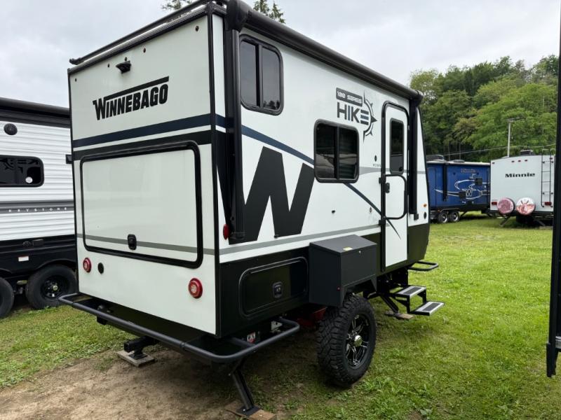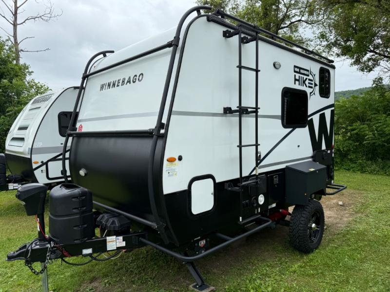 The Hike 100 travel trailers by Winnebago Industries Towables are the outdoor enthusiasts dream RV! It's light enough to be towed by smaller tow vehicles, but still includes plenty of space for your gear. Each model is constructed with one-piece thermo-foil insulation, an NXG engineered frame, a fully enclosed underbelly and tanks, plus a fully walkable roof. You will love the 200-watt solar panel with side-mount solar prep for your off-grid needs, and the patented powder coated exterior exoskeleton rack will be perfect for kayaks, hiking gear, or paddleboards. There are also thick core pass-through storage doors outside, along with a power awning with LED lights, plus power stabilizer jacks and a power tongue jack to be set up in no-time! The interior features contemporary cabinetry, USB ports to charge your electronics, additional gear storage, plus a portable JBL speaker to listen to your favorite tunes at the campsite.