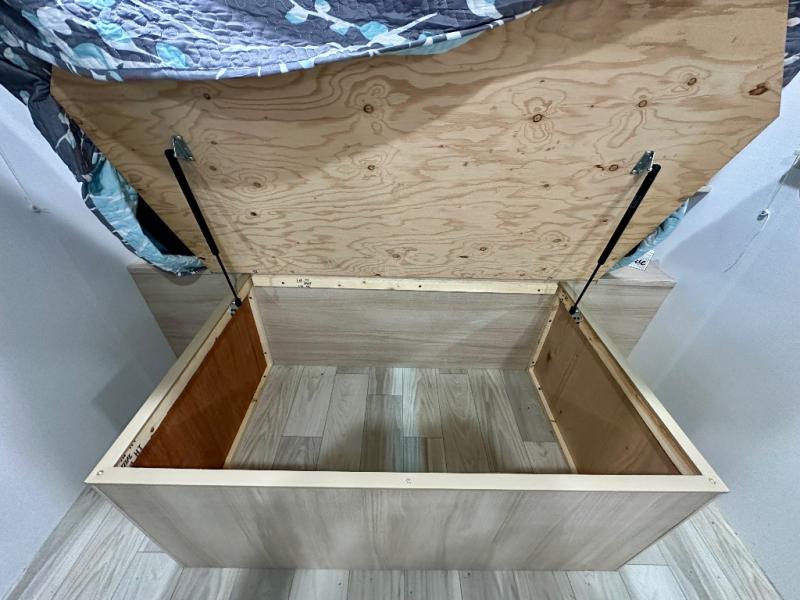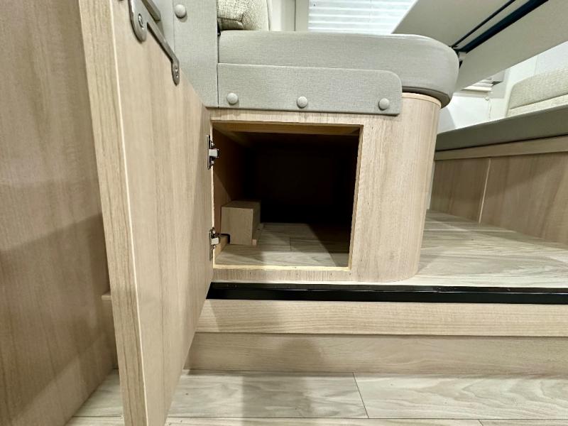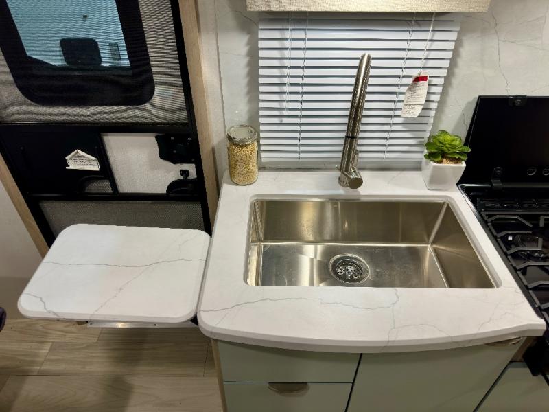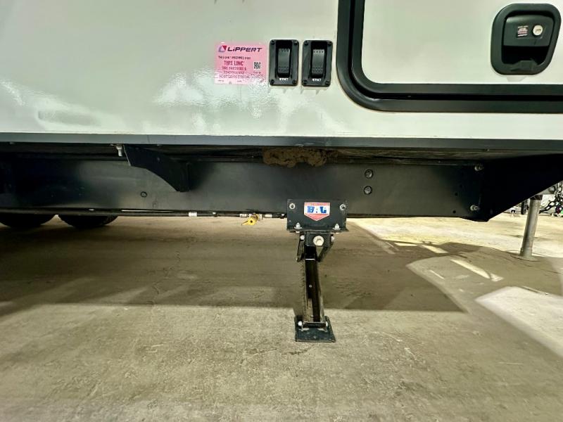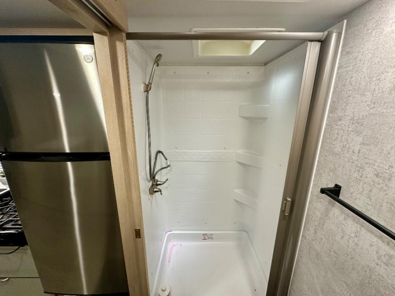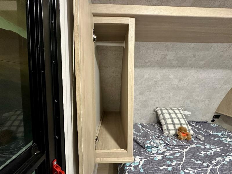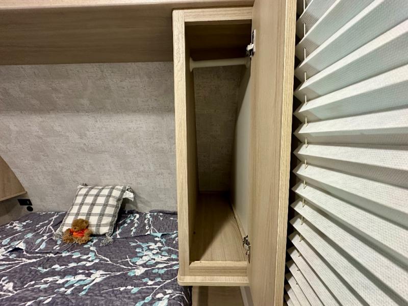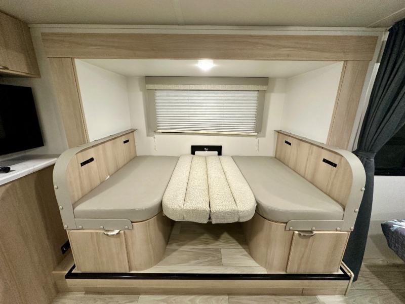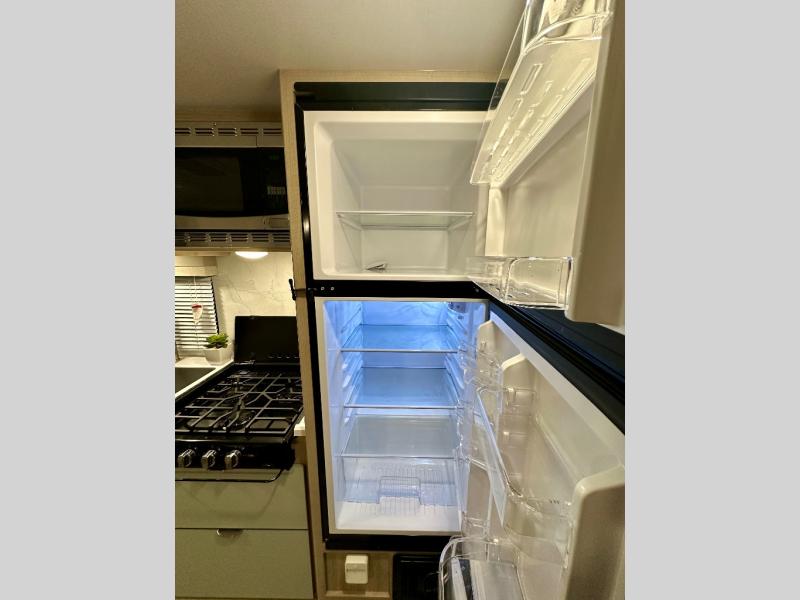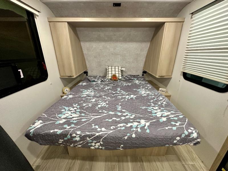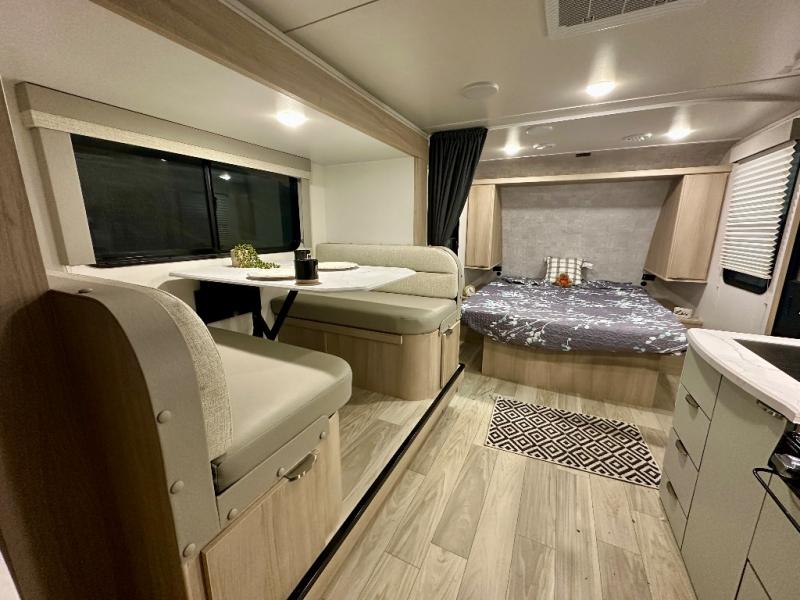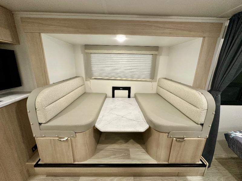 Pack your bags and head to the campground with this travel trailer! You will love all that it has to offer from the full rear bathroom with shower and a wardrobe for your clothes and linens to the front 60" x 74" RV queen bed with a wardrobe on one side, a nightstand on the other, and a privacy curtain to draw at night. The 44" x 72" booth dinette slide is not only a great place to enjoy your meals at or play card games, but it can also be transformed into an extra sleeping space if you want to bring along a guest. When you don't feel like making dinner, you can easily pop in some leftovers or a bag of popcorn into the convection microwave and relax while you watch a movie on the LED TV!