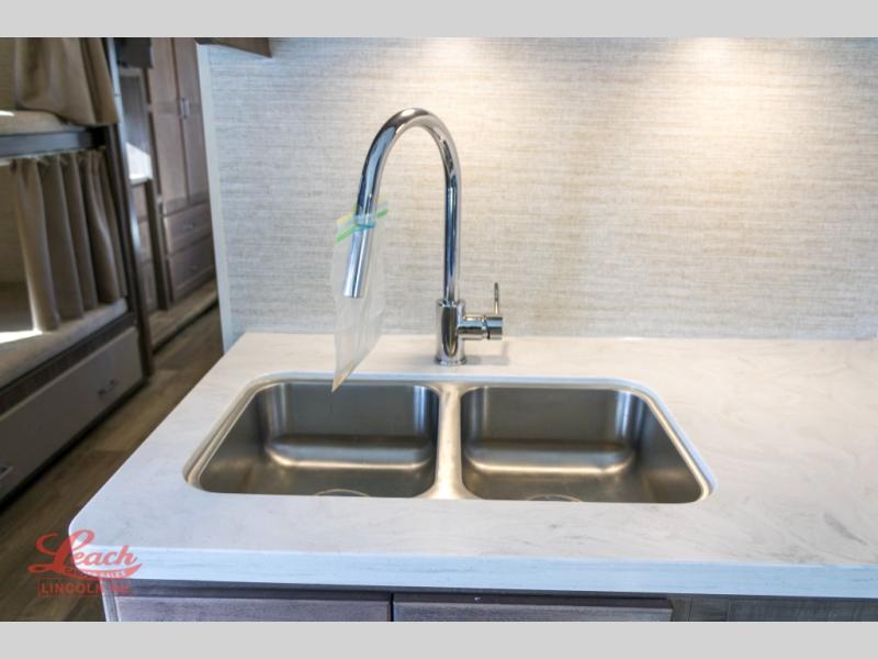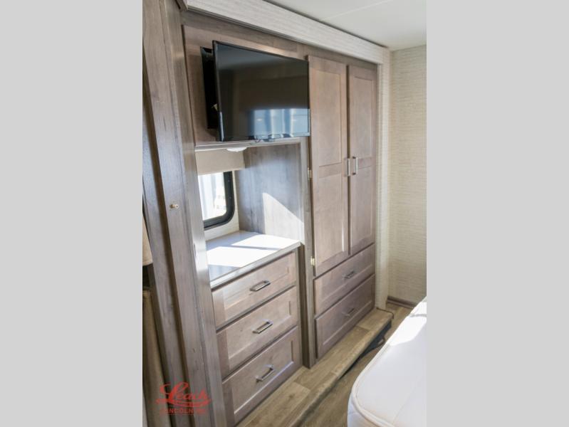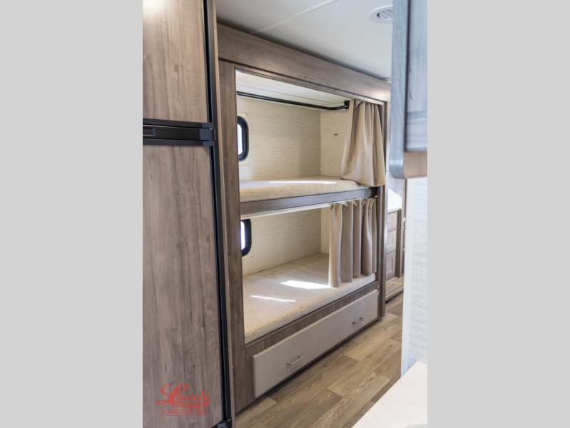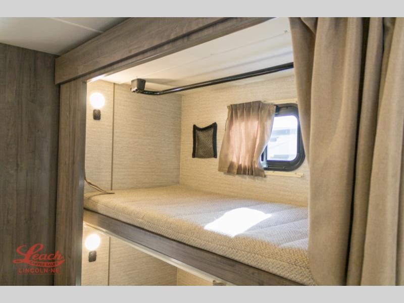 Enjoy plenty of walking around space with two slides in this motorhome! The kids will love having a set of 30" x 73" bunk beds to sleep on at night and there is also a 57" x 95" bunk over cab, a 40" x 70" sofa bed, and a 45" x 74" U-shaped dinette that can be transformed for more friends to tag along. If you don't need that much sleeping space then you could switch out the sofa bed for the optional theater seating. The rear private bedroom has a 60" x 75" queen bed with shirt closets and nightstands on either side, a wardrobe, and a chest of drawers with a TV location for your entertainment. Everyone can stay squeaky clean with the 26" x 38" shower with a skylight for added headroom and natural lighting in the full bathroom!