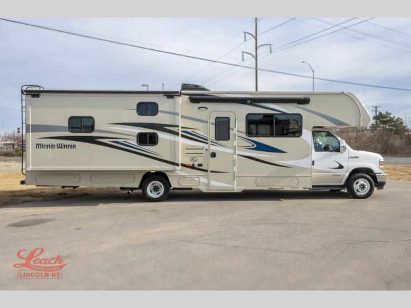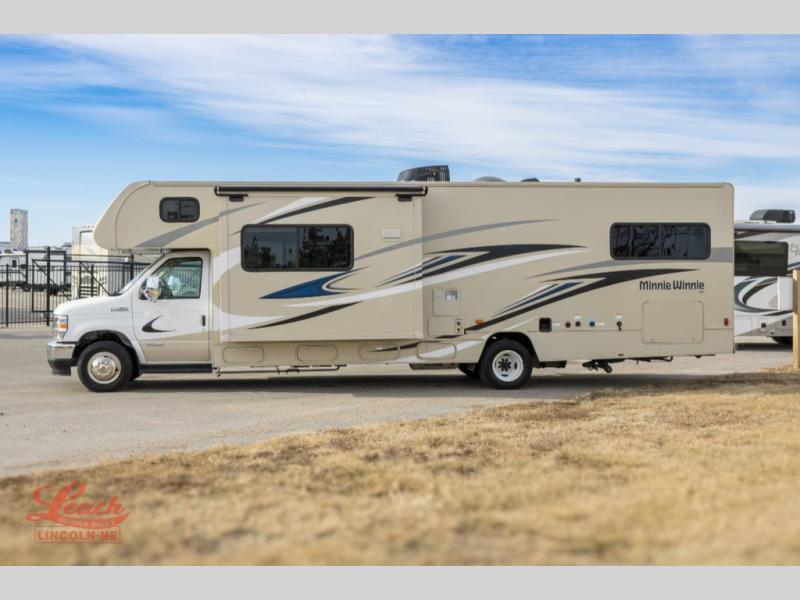 Choose your adventure with one of these Winnebago Minnie Winnie Class C gas motorhomes! The new 7.3L V8 premium engine and Ford E350 or E450 chassis makes light work of long hills. Their superior craftsmanship that was designed and built for you is shown through the Smart Driver Assist technology that includes adaptive cruise control, lane departure warning, forward collision warning, and more. With flexible seating/sleeping options and a full galley with Corian solid surface countertops, everyone will stay well rested and fed. You can store all of your traveling necessities between the overhead cabinets throughout the inside and the exterior lighted large trunk storage compartment for your outdoor gear. Come find the model perfect for you today!