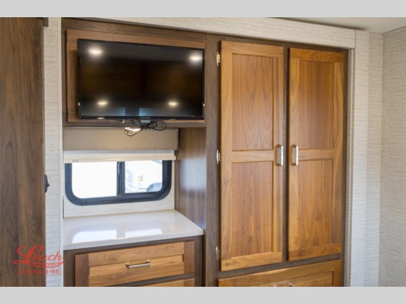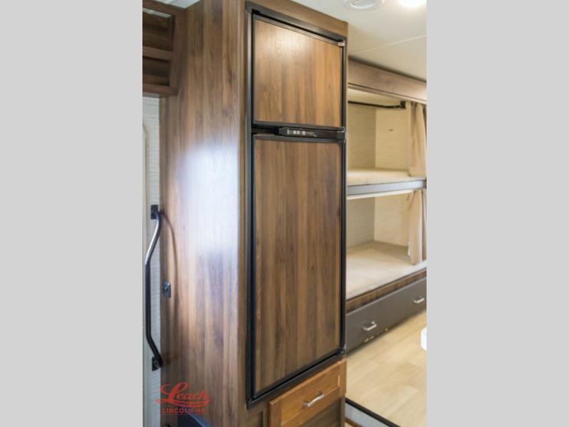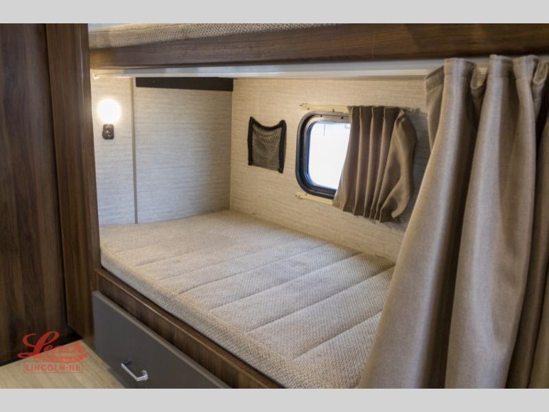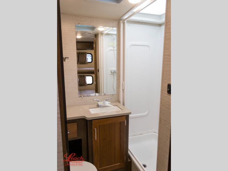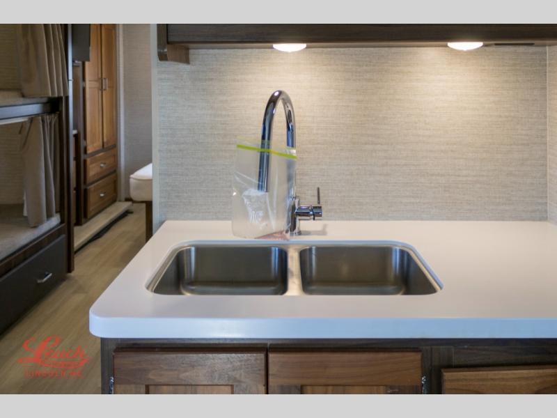 Enjoy plenty of walking around space with two slides in this motorhome! The kids will love having a set of 30" x 73" bunk beds to sleep on at night and there is also a 57" x 95" bunk over cab, a 40" x 70" sofa bed, and a 45" x 74" U-shaped dinette that can be transformed for more friends to tag along. If you don't need that much sleeping space then you could switch out the sofa bed for the optional theater seating. The rear private bedroom has a 60" x 75" queen bed with shirt closets and nightstands on either side, a wardrobe, and a chest of drawers with a TV location for your entertainment. Everyone can stay squeaky clean with the 26" x 38" shower with a skylight for added headroom and natural lighting in the full bathroom!