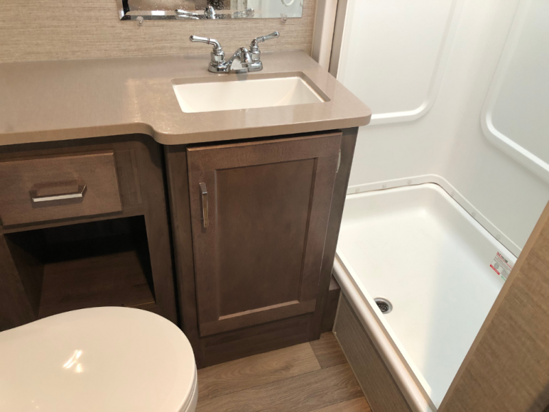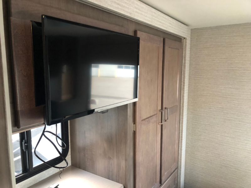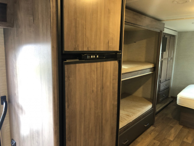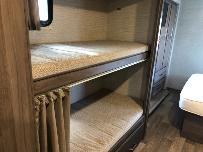 Enjoy plenty of walking around space with two slides in this motorhome! The kids will love having a set of 30" x 73" bunk beds to sleep on at night and there is also a 57" x 95" bunk over cab, a 40" x 70" sofa bed, and a 45" x 74" U-shaped dinette that can be transformed for more friends to tag along. If you don't need that much sleeping space then you could switch out the sofa bed for the optional theater seating. The rear private bedroom has a 60" x 75" queen bed with shirt closets and nightstands on either side, a wardrobe, and a chest of drawers with a TV location for your entertainment. Everyone can stay squeaky clean with the 26" x 38" shower with a skylight for added headroom and natural lighting in the full bathroom!