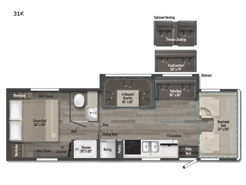 You won't want to travel any other way once you step inside this motorhome! It features a rear private bedroom with a 60" x 80" queen bed that has wardrobes on either side and a TV location for entertainment. The separated bathroom makes it easy for one person to freshen up in the 26" x 30" shower with a skylight while another uses the private toilet and sink. A sliding door closes off the bathroom from the kitchen area which has a three burner range with glass cover and oven and a two way large double door 8 cu. ft. refrigerator/freezer with woodgrain paneling to store your perishables. Enjoy your meals at the 45" x 82" U-shaped dinette then relax on the 40" x 60" sofa bed which can be switched out for either the optional theater seating or optional 58" x 74" TrueComfort sofa. You even have a 57" x 95" bunk over cab for sleeping or storage space!