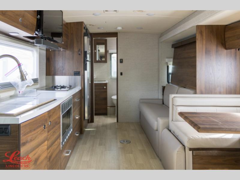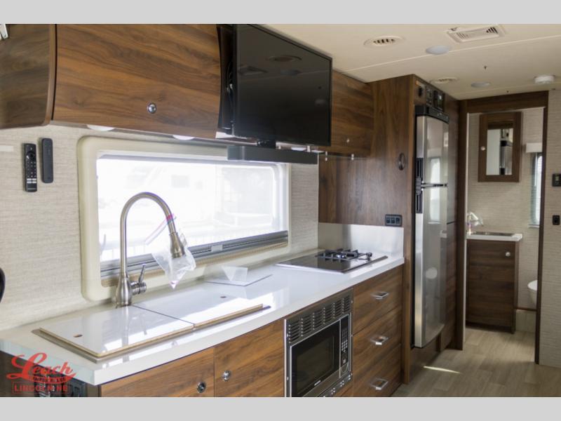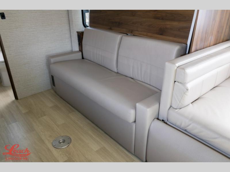 This family-friendly coach offers sleeping space for six when you utilize the Murphy Bed, the cabover bunk and the U-shaped dinette with footrests as sleeping space! Now you might have decided to add the theater seating option, the choice is yours. During the day, the sofa easily replaces the Murphy bed so you can dine at the pedestal table that you grabbed from the front area's location. The heated power control cab seats include armrests, adjustable lumbar support, headrest, recline, slide and manual swivel functions giving you ultimate comfort on the road and while at your RV spot. The cook will love having a galley kitchen with a microwave/convection oven and 12V compressor refrigerator/freezer to keep everyone fed.