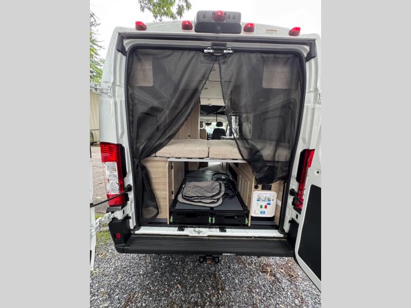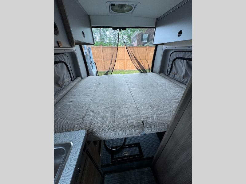 Enjoy a weekend ride in the mountains or make it an overnight stay with versatile sleeping options in this camper van. You'll find the Murphy+ bed in the back will provide a great night's rest, or you can choose the optional sofa/bed with added belted seating if you have more tag-alongs. And of course the little ones will love the pop-top sleeping area to climb into each night. After you've freshened up in the convenient wet bath, prepare breakfast on the two burner range, and the milk and eggs can go back in the 3.0 cu. ft. single door refrigerator/freezer. This model also includes rear double doors with screens to let the breeze in and keep bugs out!
