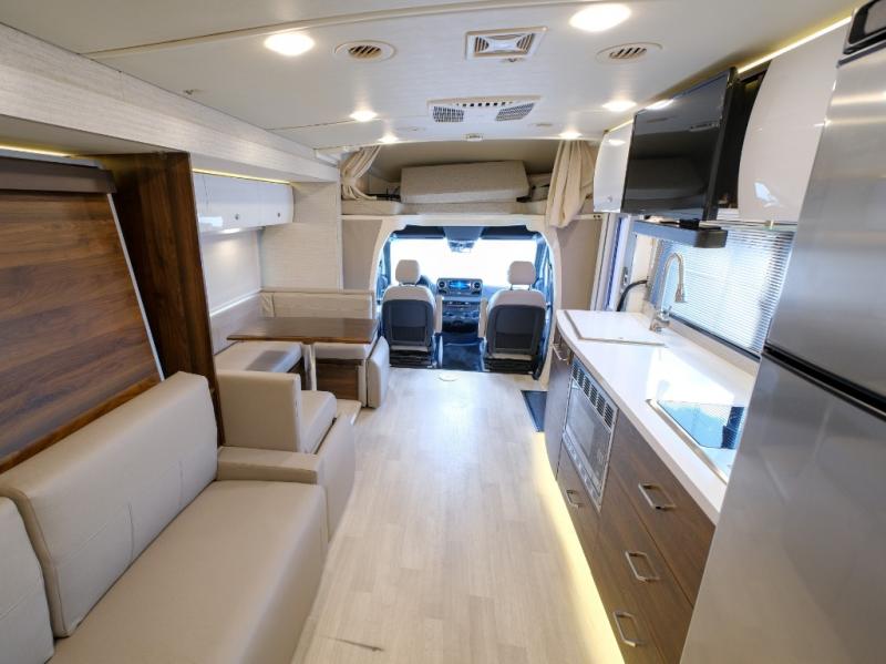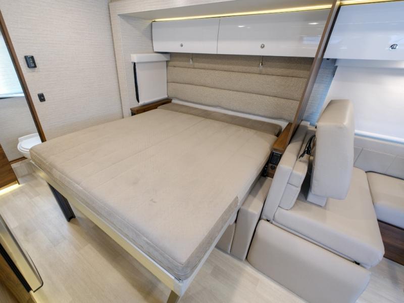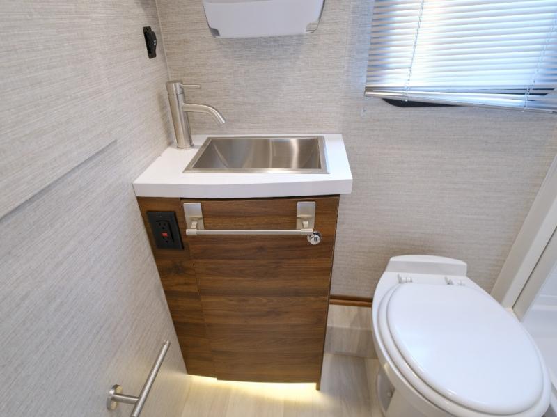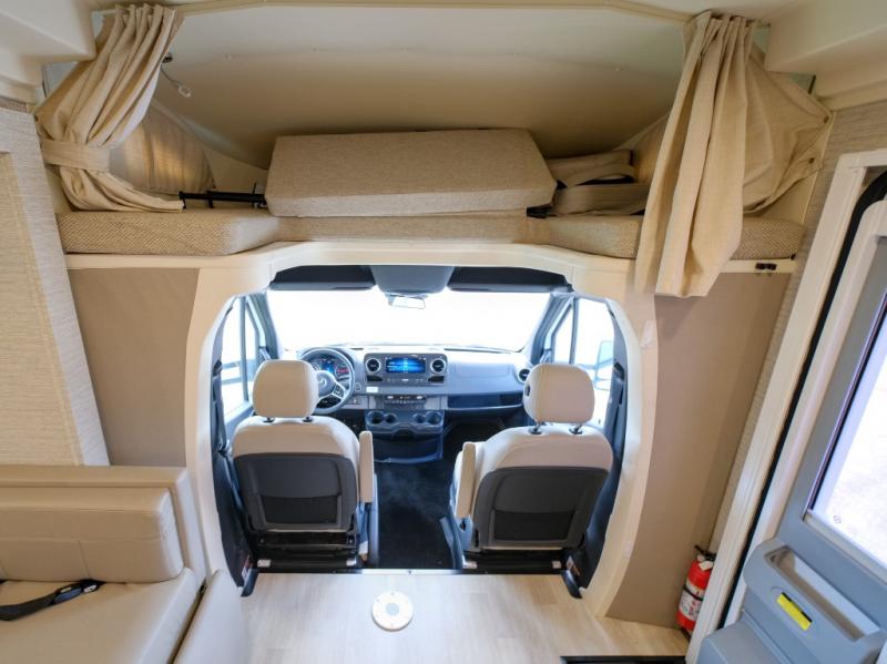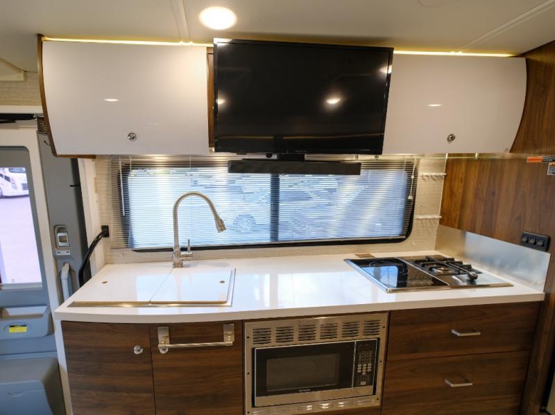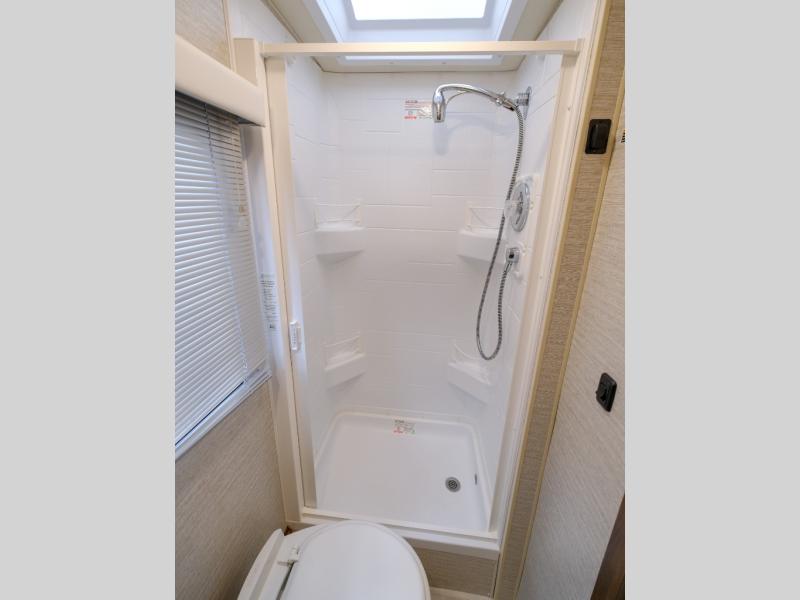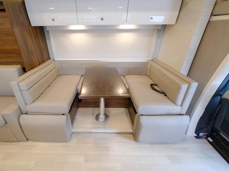 A couple or family will enjoy the look of the interior each time they take this View Class C diesel motorhome on the road. With the curved cabinets, the lighted soft-close galley drawers, and the sprung-cushion dinette and sofa seats, there will surely be a favorite feature for everyone. You will be able to easily set up the queen Murphy+ bed when it's time for bedtime while the kids sleep on the bunk above the cab or the U-shaped dinette. Everyone can get cleaned up in the full rear bathroom that has a space-saving sliding door before making meals with full kitchen amenities including a convection microwave/oven.