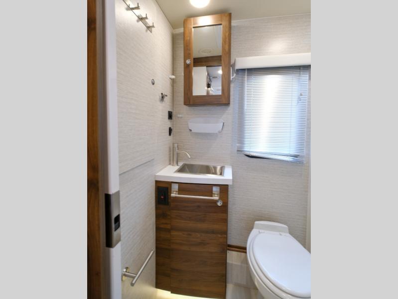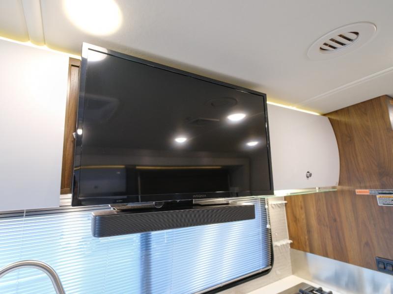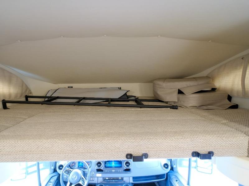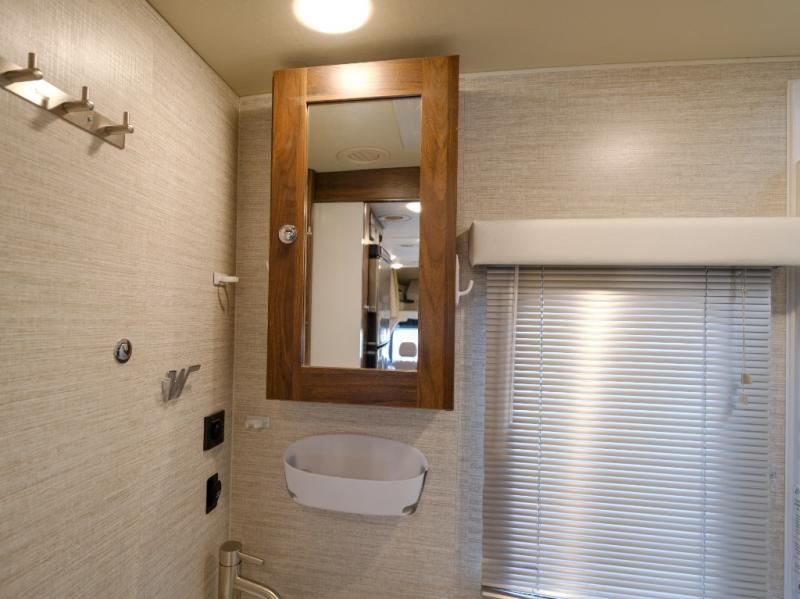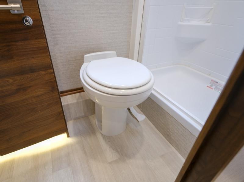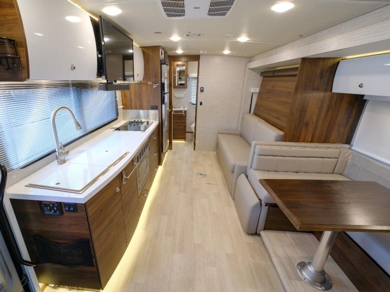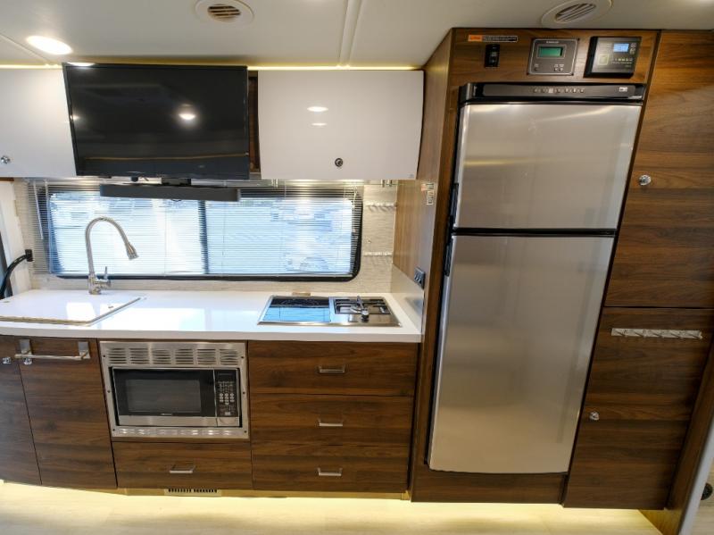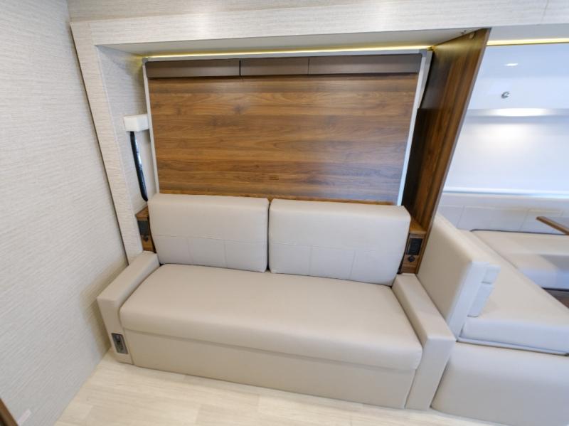 A couple or family will enjoy the look of the interior each time they take this View Class C diesel motorhome on the road. With the curved cabinets, the lighted soft-close galley drawers, and the sprung-cushion dinette and sofa seats, there will surely be a favorite feature for everyone. You will be able to easily set up the queen Murphy+ bed when it's time for bedtime while the kids sleep on the bunk above the cab or the U-shaped dinette. Everyone can get cleaned up in the full rear bathroom that has a space-saving sliding door before making meals with full kitchen amenities including a convection microwave/oven.