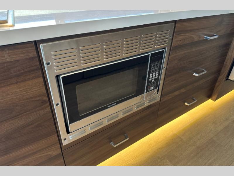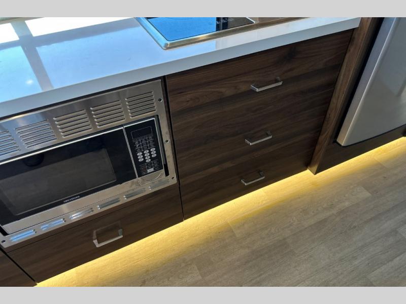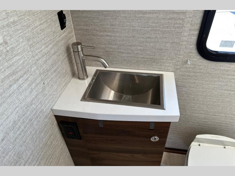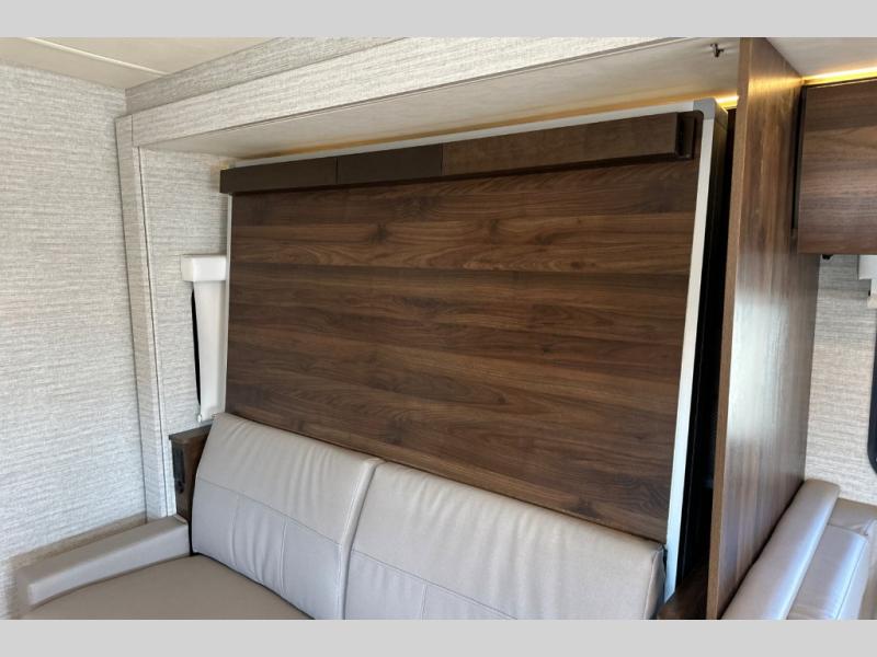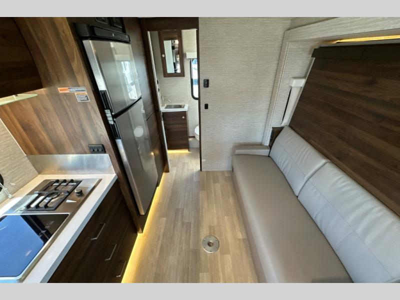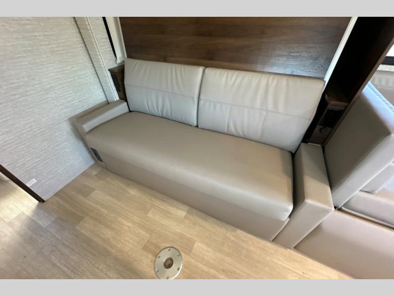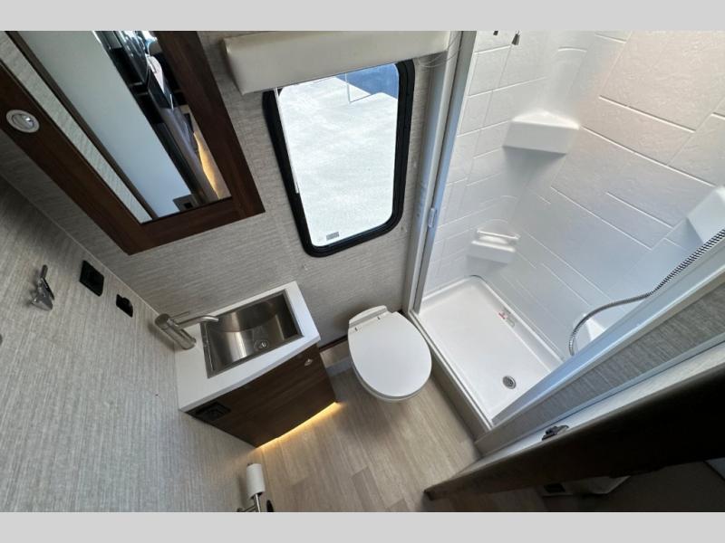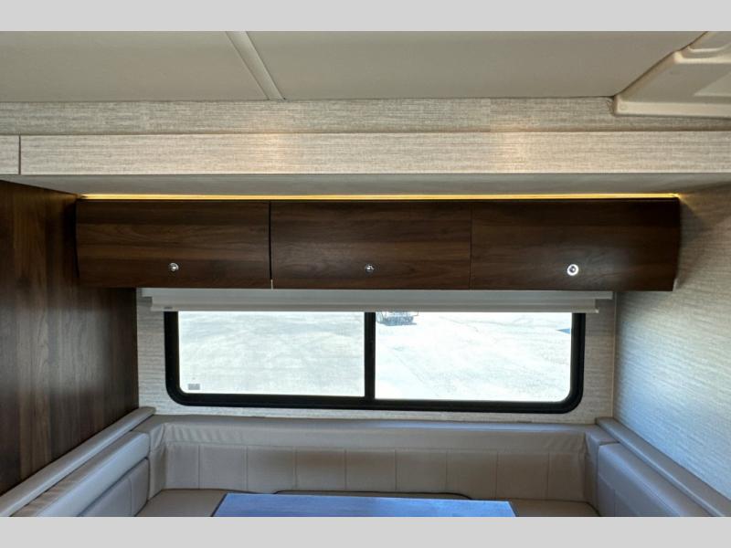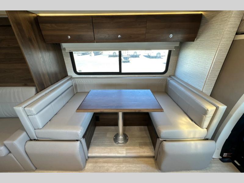 A couple or family will enjoy the look of the interior each time they take this View Class C diesel motorhome on the road. With the curved cabinets, the lighted soft-close galley drawers, and the sprung-cushion dinette and sofa seats, there will surely be a favorite feature for everyone. You will be able to easily set up the queen Murphy+ bed when it's time for bedtime while the kids sleep on the bunk above the cab or the U-shaped dinette. You might like to add the theater seating option with swivel tables if you don't need that extra sleeping space. Everyone can get cleaned up in the full rear bathroom that has a space-saving sliding door before making meals with full kitchen amenities including a convection microwave/oven.