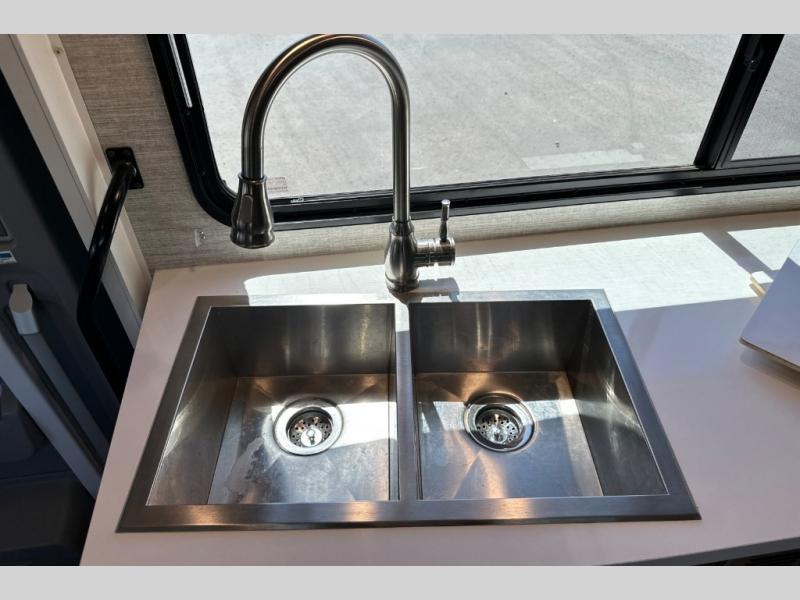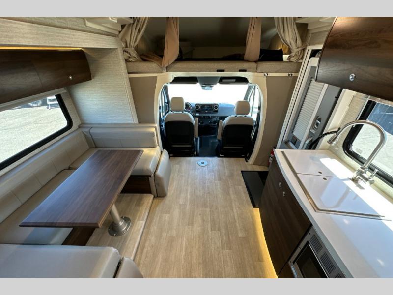 With each View Class C diesel motorhome by Winnebago, you can extend your trips off grid with the industry-leading holding tanks, the two 100W solar panels, the two deep-cycle Group 31 RV batteries, the 2,000W inverter, plus the 3,600W Cummins Onan MicroQuiet LP generator. The insulated sleeper deck is built with premium thermal and acoustic insulation allowing the SuperShell sleeper deck to be more comfortable and relaxing during any season. The View is built on a Mercedes-Benz Sprinter chassis with advanced safety features giving you peace of mind, and the MBUX touchscreen infotainment system has intelligent voice control, navigation, a Wi-Fi hotspot, and more! The interior offers luxury space and simple solutions for storage, plus it also has vinyl flooring and laminate countertops for easy clean-up.