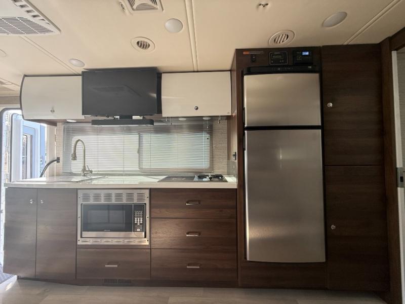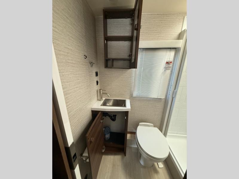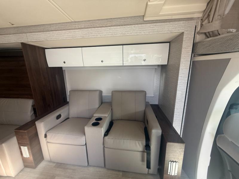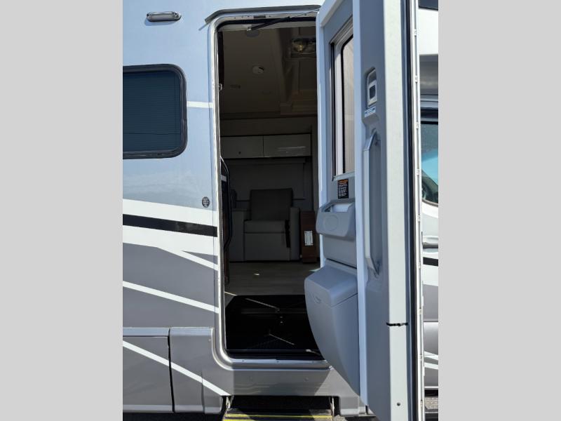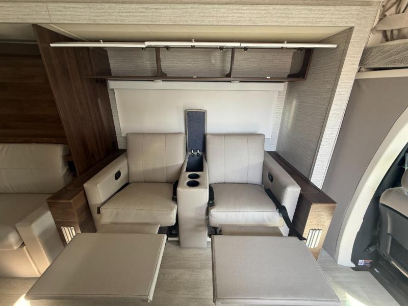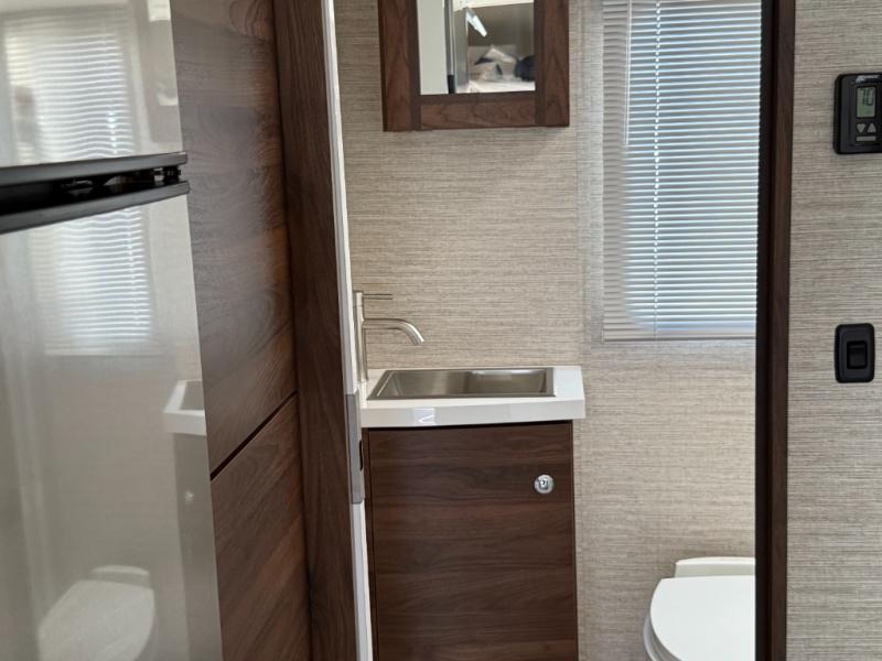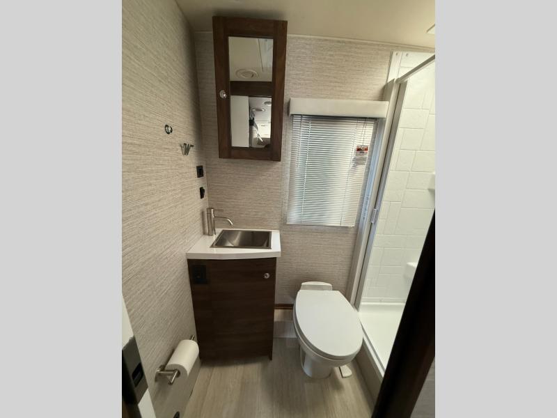 A couple or family will enjoy the look of the interior each time they take this View Class C diesel motorhome on the road. With the curved cabinets, the lighted soft-close galley drawers, and the sprung-cushion dinette and sofa seats, there will surely be a favorite feature for everyone. You will be able to easily set up the queen Murphy+ bed when it's time for bedtime while the kids sleep on the bunk above the cab or the U-shaped dinette. You might like to add the theater seating option with swivel tables if you don't need that extra sleeping space. Everyone can get cleaned up in the full rear bathroom that has a space-saving sliding door before making meals with full kitchen amenities including a convection microwave/oven.