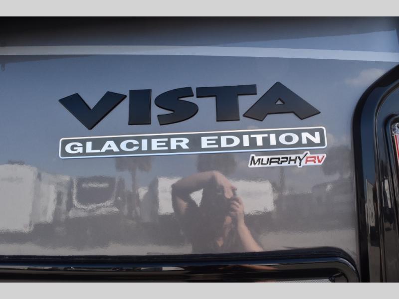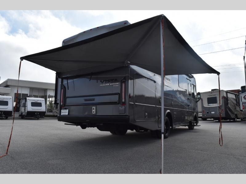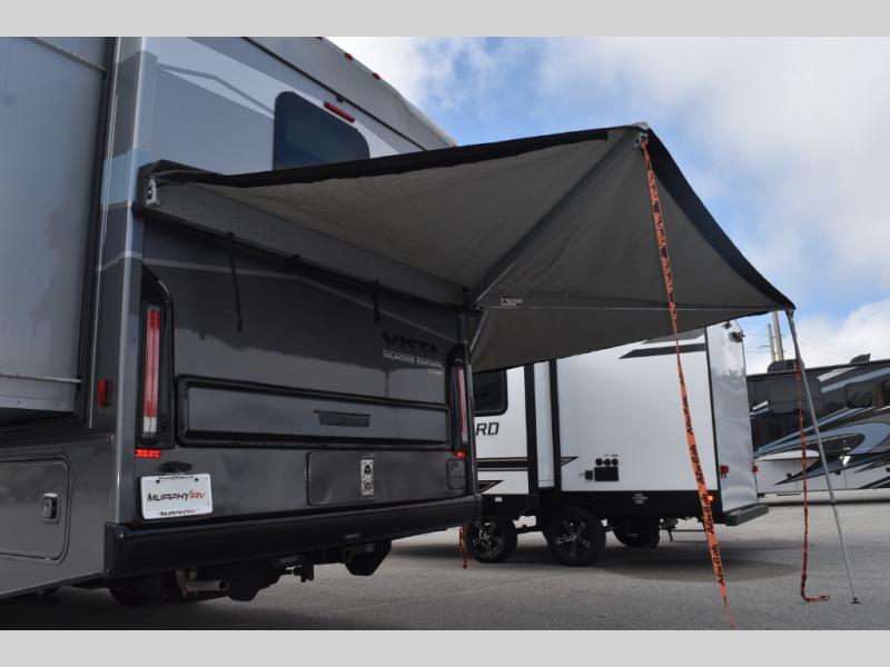 The Winnebago Vista National Park Foundation Limited Edition Class A gas motorhome is designed to fit almost any campsite! You can go off the grid with the upgraded solar energy system which has a standard 320 amp hour lithium-ion battery, a charge controller, and three solar panels for three times the unplugged power. The Batwing awning overlaps the standard armless patio awning for two sides of seamless wraparound protection to enhance your outdoor living. Speaking of enhanced outdoor living, the exterior kitchen included in the Tailgate package comes with a refrigerator, a sink, and a quick connect LP hose for a portable stove or grill, plus more convenient accessories. The outdoors are brought inside through the frameless tinted windows and the beautiful Salinas oak cabinets. Come check it out today!