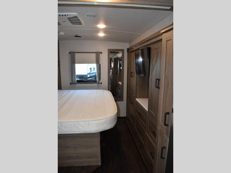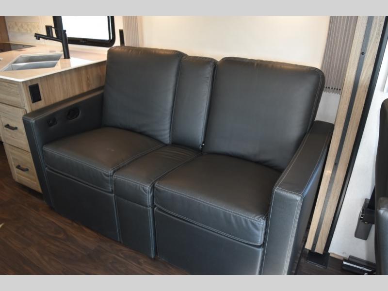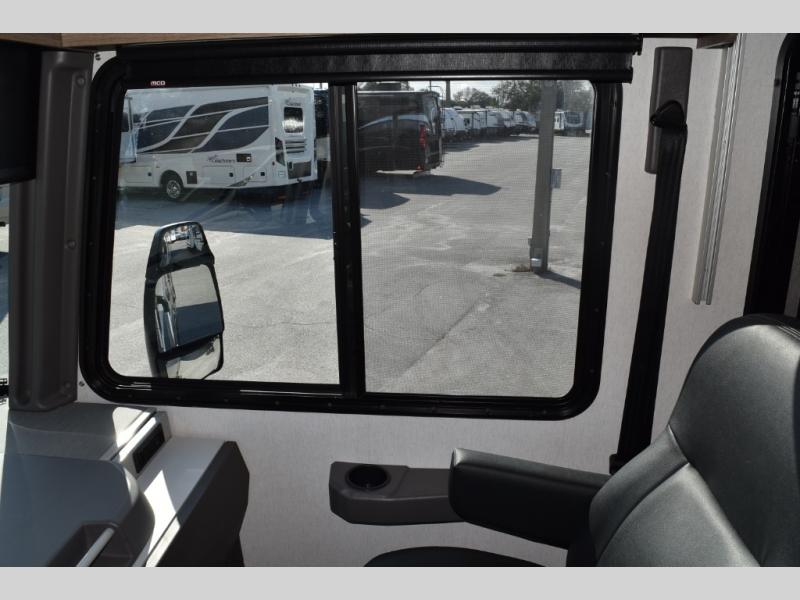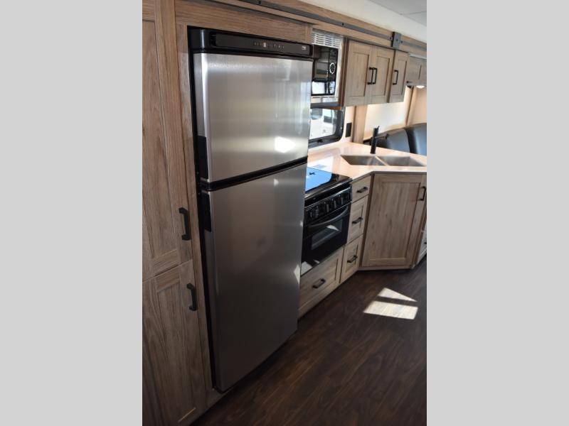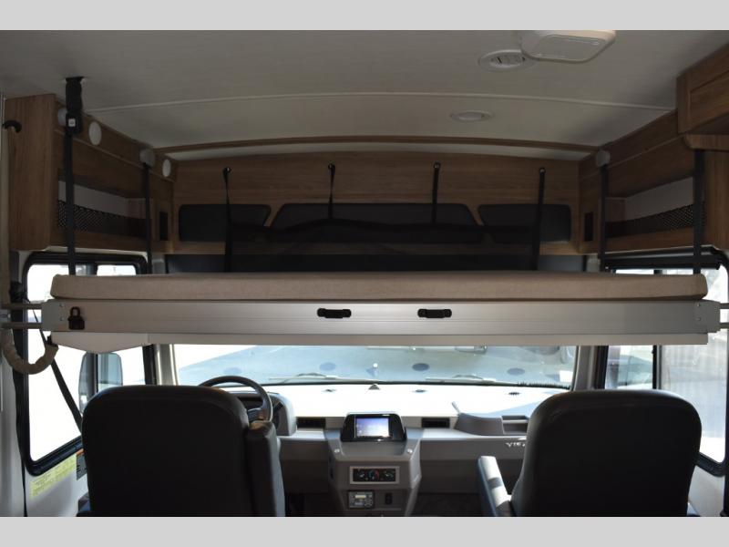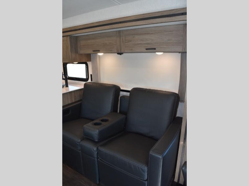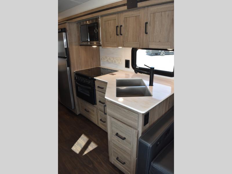 Head to your favorite destinations with this motorhome! You can travel with your spouse or bring an extra guest or two when you add the optional StudioLoft 50" x 80" powered bed above the cab. The 40" x 66" sofa bed can also transform into an extra sleeping space but if you don't need it then you can switch it out for the optional theater seating. Enjoy delicious home cooked meals while on the road with the three burner cooktop or head to the exterior kitchen to breathe in some fresh air while you cook. Eat your meals at the 42" x 70" dinette with Hi-Lo table and freshen up each morning in the full bathroom featuring a 26" x 38" shower. The rear private bedroom has a 72" x 75" king bed to lay your head on at night and wardrobes on either side of a storage area with a location for an optional TV to be added!