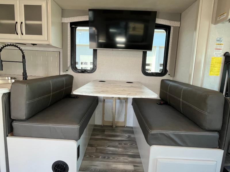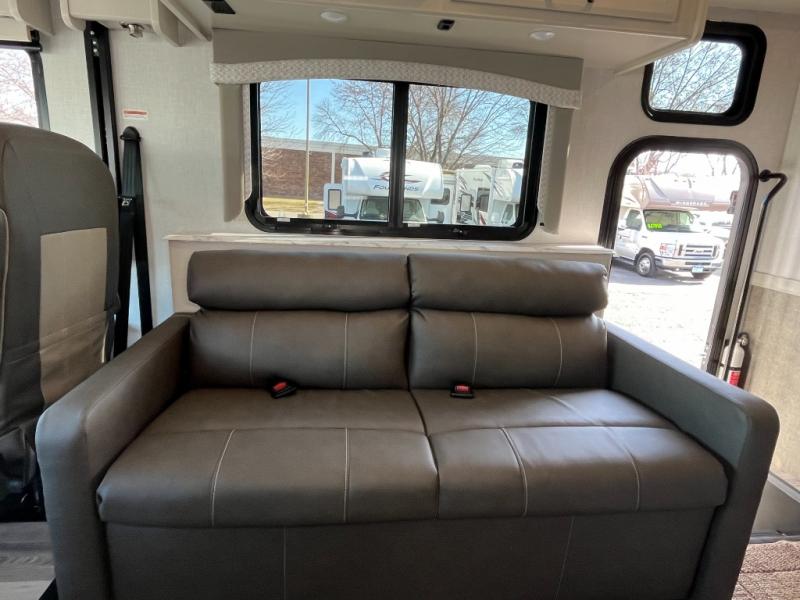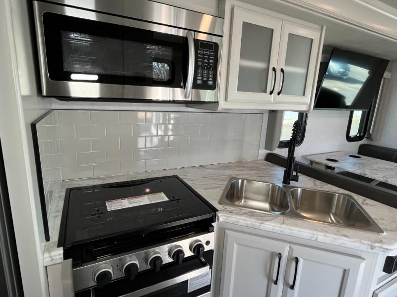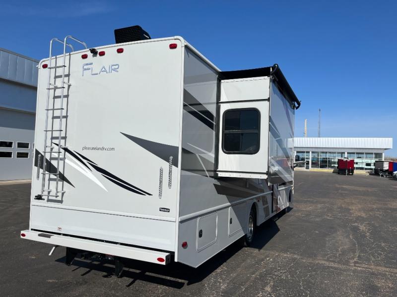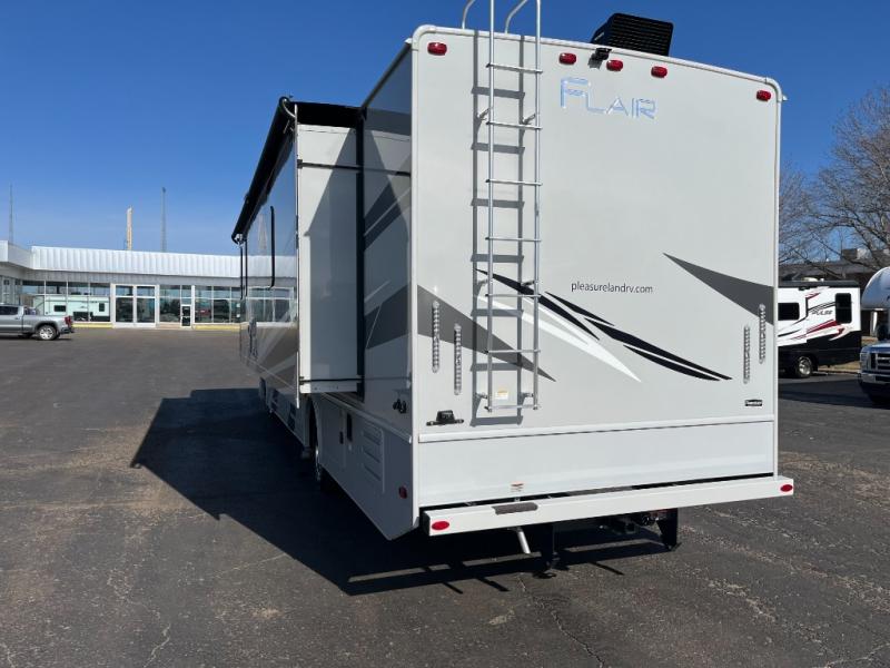 Step up your camping game by adding the Fleetwood Flair Class A gas motorhome to the line-up! The 7.3L 350HP engine with 468 LB/FT of torque forms the base, and the 8,000-LB towing capacity gives you the chance to bring a car with your coach. On the exterior you'll find an automotive, bonded one-piece windshield, exterior-mounted sideview cameras, and an exterior LED TV. The interior is decked out with a Sony dash radio, an all-new electronic instrument panel, a digital dash, and reclining/swivel cab chairs. There is also a workstation at the automotive-style dash, and the Bluetooth coach system in the bedroom has exterior speakers for fun party nights.