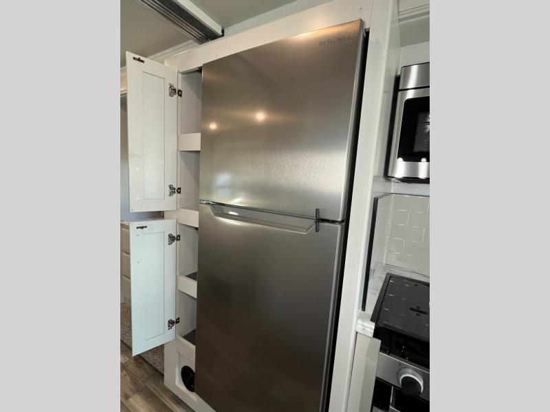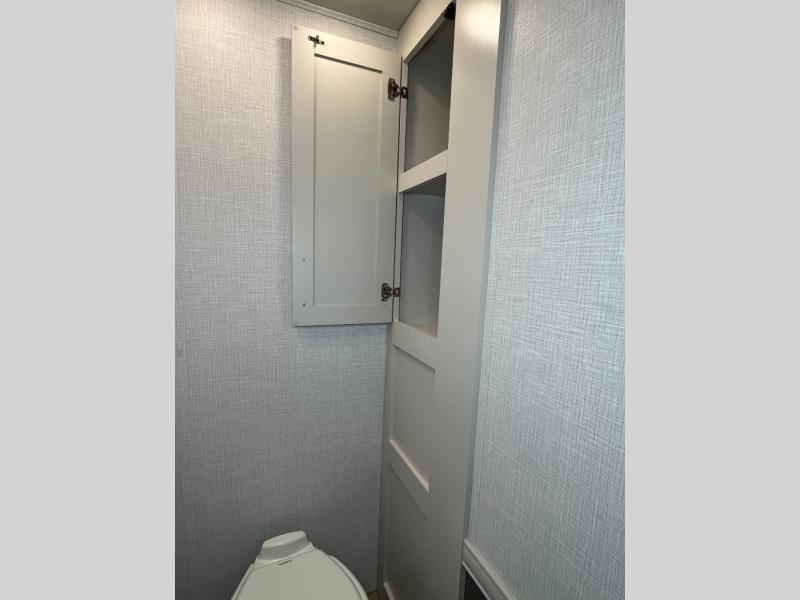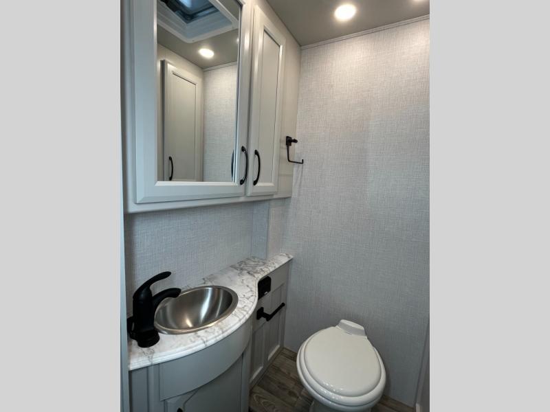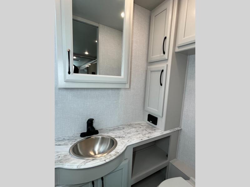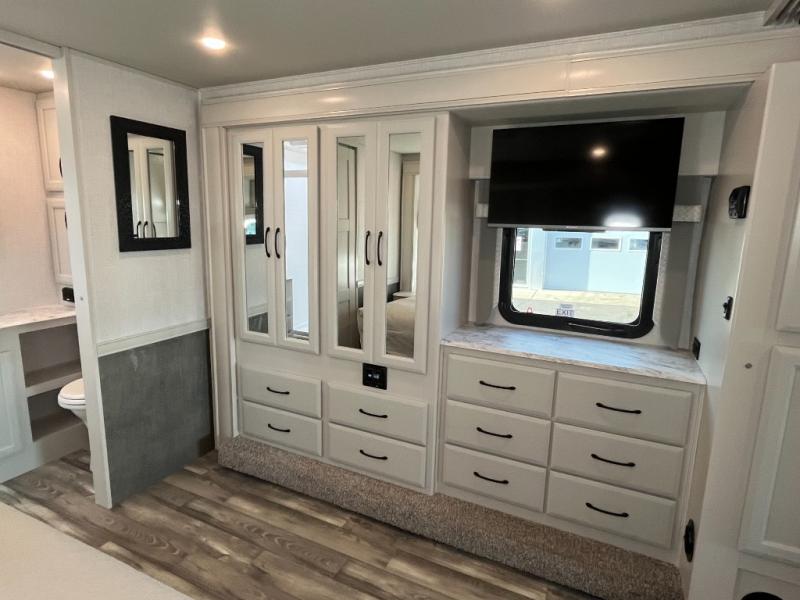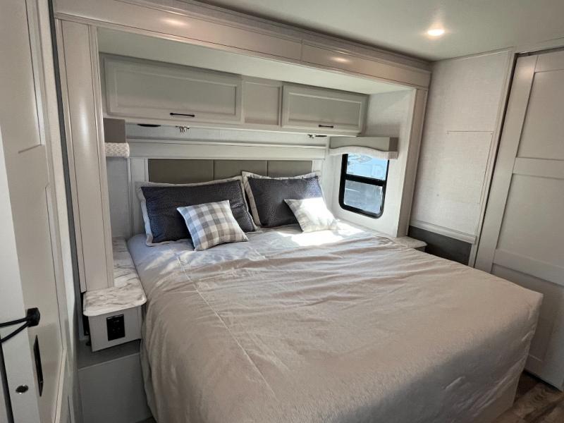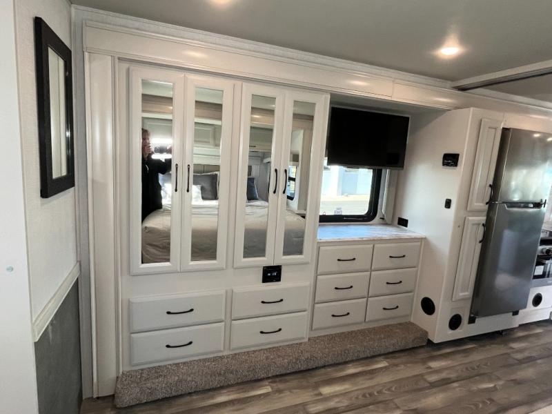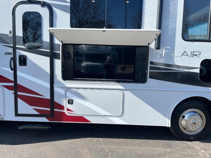 Experience your best vacations in this Flair Class A gas motorhome! The full rear bathroom has a 30" x 36" shower to start your mornings off feeling fresh. Now that you're nice and clean, you can get ready in the master suite with your clothes hanging in the wardrobe and stored in the dresser with an LED TV above it, plus there is a Serenity Series 72" x 74" king bed slide so you know you will get a good night's rest. The chef will have an easy time preparing home cooked meals with the three burner cooktop and residential refrigerator which can be switched out for an optional LP-RV style refrigerator. The half bathroom is conveniently next to the kitchen for quick bathroom breaks while cooking and has a wardrobe/storage and a linen closet with exterior storage below it. Relax each evening either indoors on the jackknife sofa and Dream Dinette or in front of the exterior LED TV!