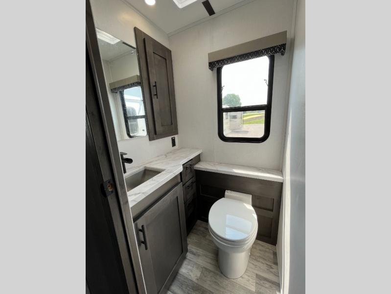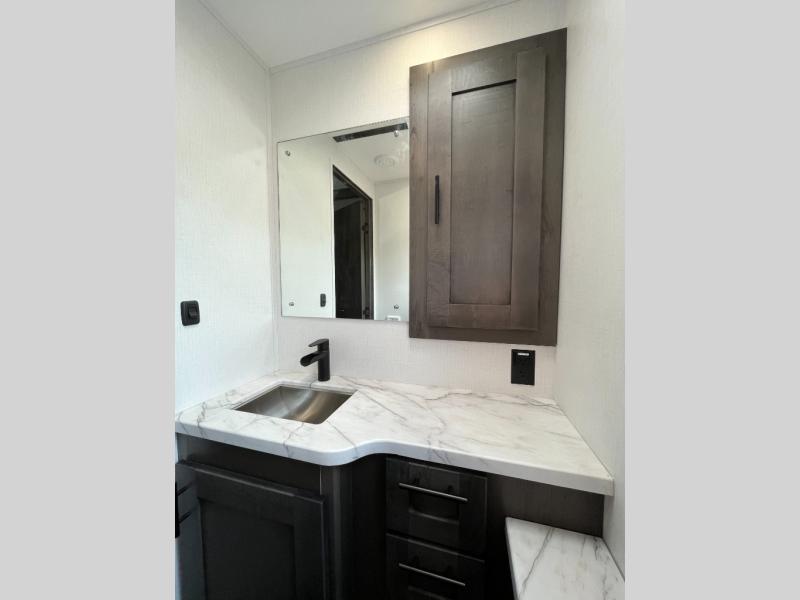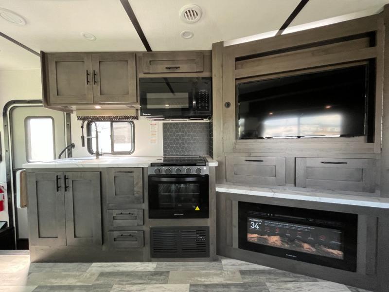 Spacious and inviting for couples or families, this FR3 Class A gas motorhome offers convenience throughout including a half bath for the kids and guests and a full rear bathroom for the owners. This full bathroom is located within the rear master suite where you will also find a king-size bed for relaxing. Once at your destination, you can quickly set up the power awning to relax outside while watching the exterior TV and visiting with other RVers. You might have decided to add the washer and dryer option in the bedroom, so a load of laundry might even get done. Once you are ready to fill your tummy, the full kitchen offers everything you need plus a residential microwave. You might even decide to relax on one of the theater seats after dinner as you watch the big game on the 40" LED 12V TV with a fireplace below.