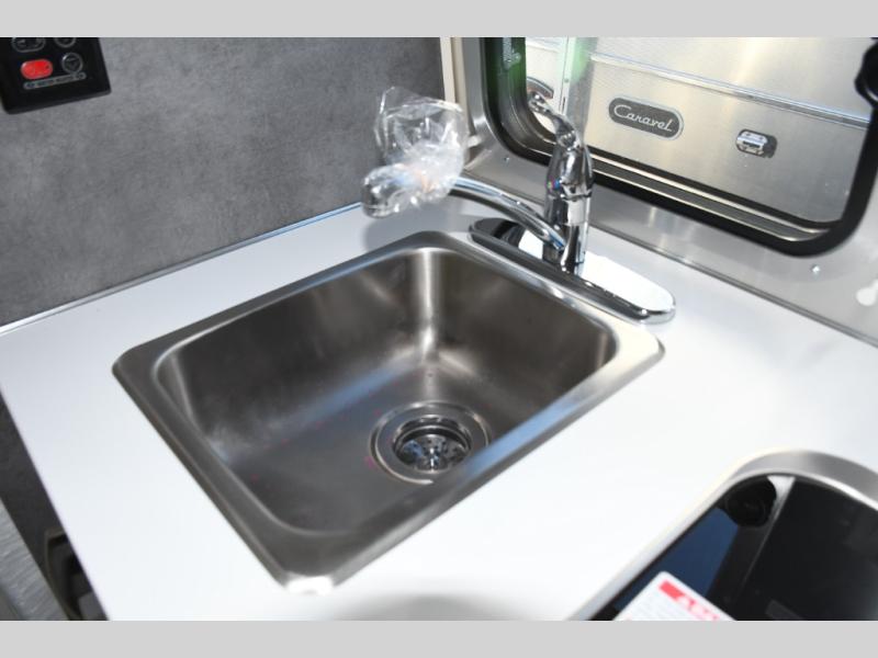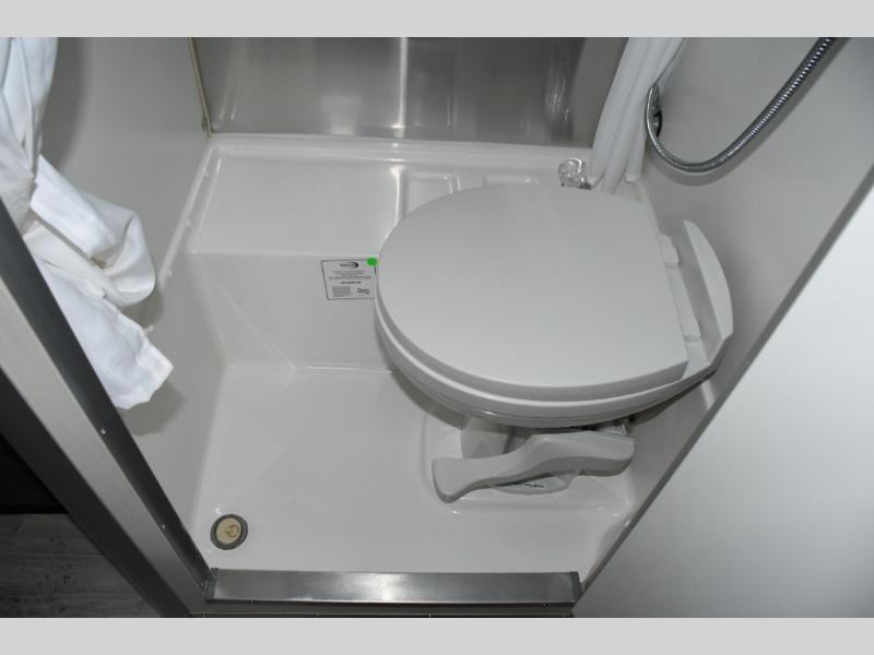 The galley kitchen is designed for real-world use, featuring quality appliances, durable countertops, and smart storage that make meal prep easy whether you’re whipping up breakfast before a hike or dinner under the stars. The rear bathroom is surprisingly spacious for a trailer of this size and includes a functional shower, adding everyday convenience to your adventures.