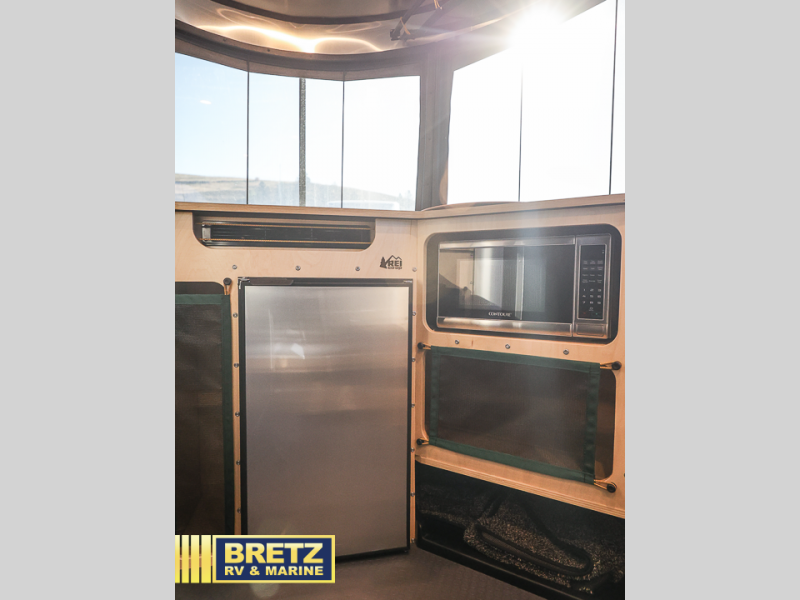 Looking for three extra inches of road clearance in an aerodynamic and easy to tow trailer? This 16X includes Goodyear all-terrain tires, solar front window protection, and stainless steel rock guards for protection against road debris. You can sleep two on the split benches or convert the half-bed on one side and the full bed-size that spans the back of the trailer. The two tables with benches allow you to dine with seating for five, surf the web, read a book and you can store the tables under the cushions. Get cleaned up in the wet bath complete with a shower, toilet and sink. And the cook will love the views while using the two-burner gas stove, sink and refrigerator. This Basecamp also offers front panoramic windows and a rear hatch allowing you to take your snowboards, skis, paddleboards and/or kayaks.