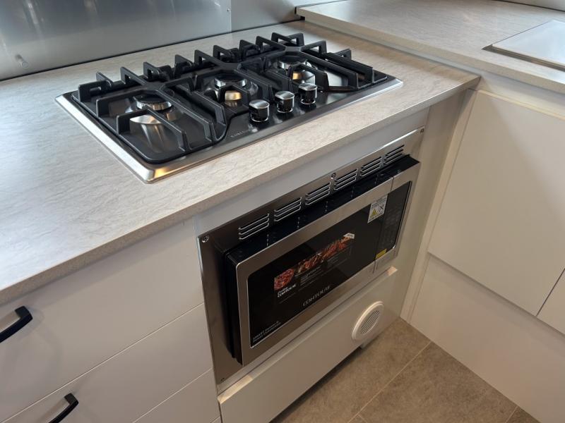 Would you like to enjoy unforgettable trips? If so, all you need is this Caravel travel trailer! The interior is outfitted with handcrafted Italian Lite-Ply laminated cabinetry, dimmable LED lighting, seamless vinyl flooring, and Ultraleather fabric on the furniture for a completely stylish and elegant look. The overhead storage has sliding doors for easy access, and the kitchen is quite engaging with its three-burner gas cooktop, microwave, stainless steel sink with Moen faucet, and Baraldi cooking vent with light. You can even use the LED reading lights at the pillowtop memory foam mattress to finish that last chapter before bed.