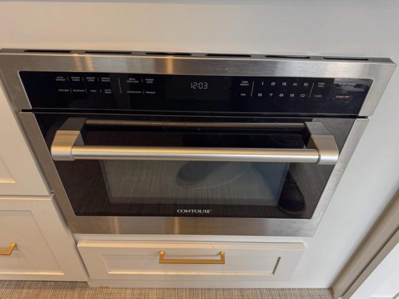 You're going to love this travel trailer that will feel more like home. The spacious full rear bath includes a large closet to hang all your clothes, a residential-style shower, and a heated towel bar you are sure to love. There is a workstation with an Ultraleather desk chair if you need to get some work done, and the media cabinet here houses the 60" projection TV. The chef of the family can prepare meals on the stainless steel three burner cooktop and convection microwave, and everyone can dine at the powered dinette. And you'll feel right at home in the front private bedroom with a power queen bed or optional twin beds!