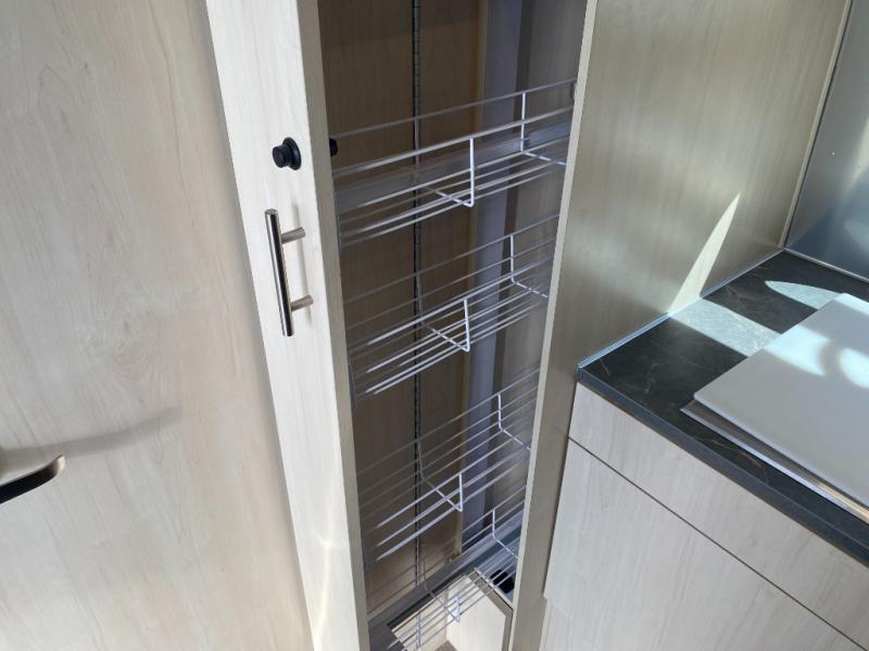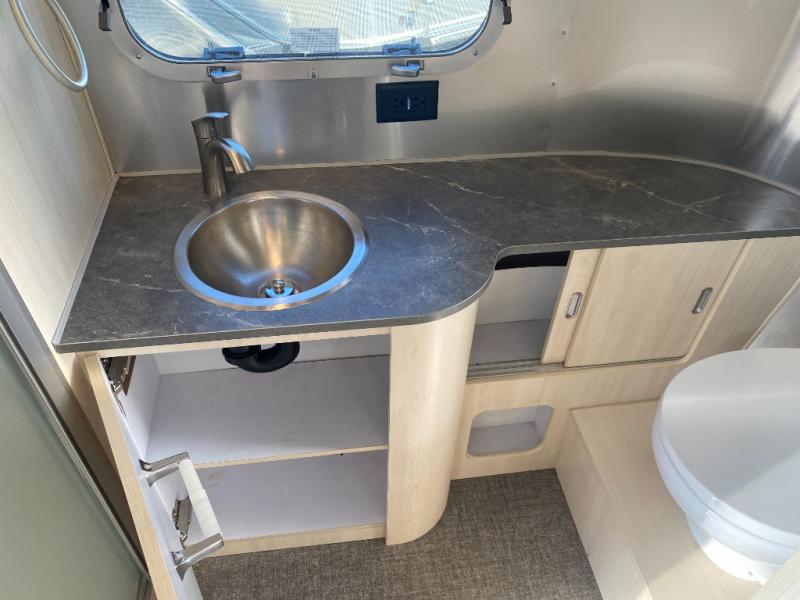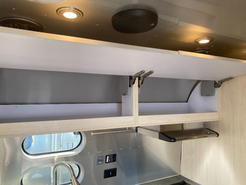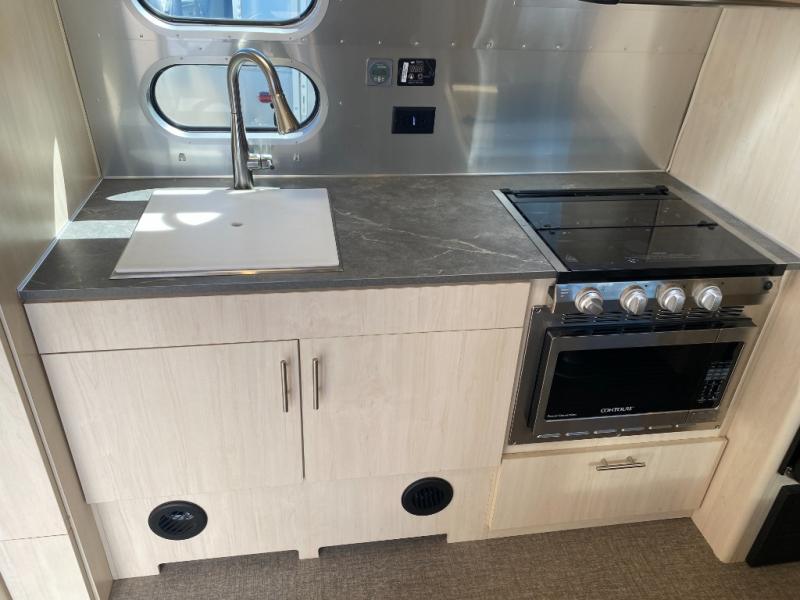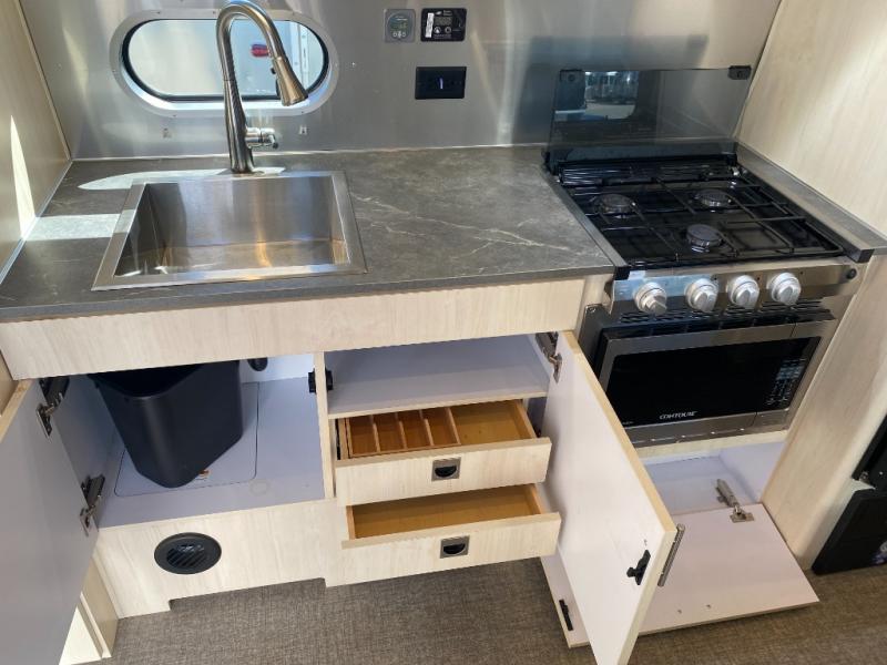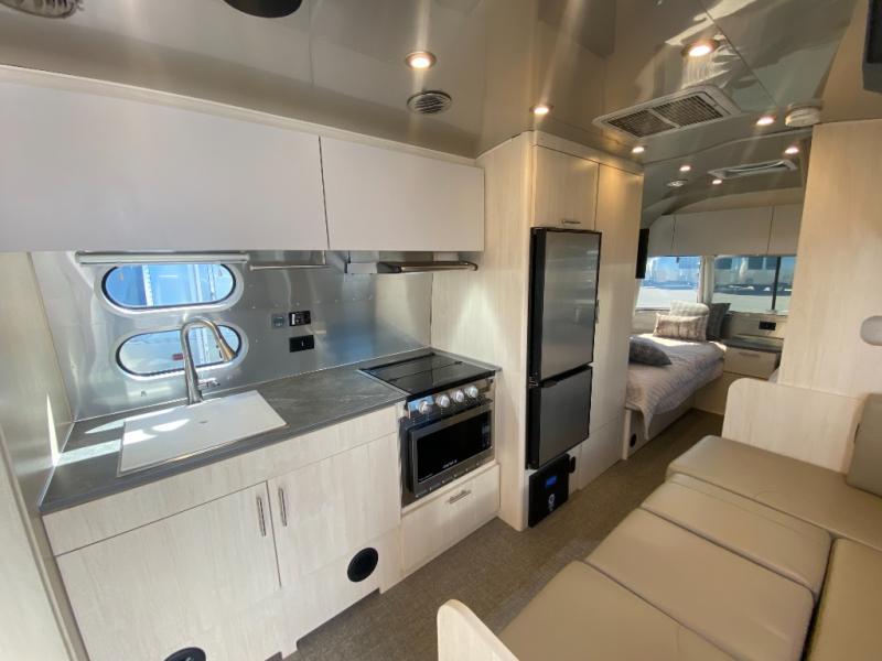 With each Flying Cloud travel trailer by Airstream, there are two axles, and each is built for ease of towing, plus there is a rear-view camera to make reversing and parking easier, and stainless steel front stone guards to protect the lower segments from road debris. The iconic Airstream design is created outside and inside by the semi-monocoque aluminum superstructure, the temperature reducing one-piece white aluminum roof, the panoramic front windows, and the stylish aluminum wheels. The interior will have you feeling right at home with handcrafted cabinetry, plenty of storage and counter space, sleek roller blinds and blackout curtains, plus residential style faucets!