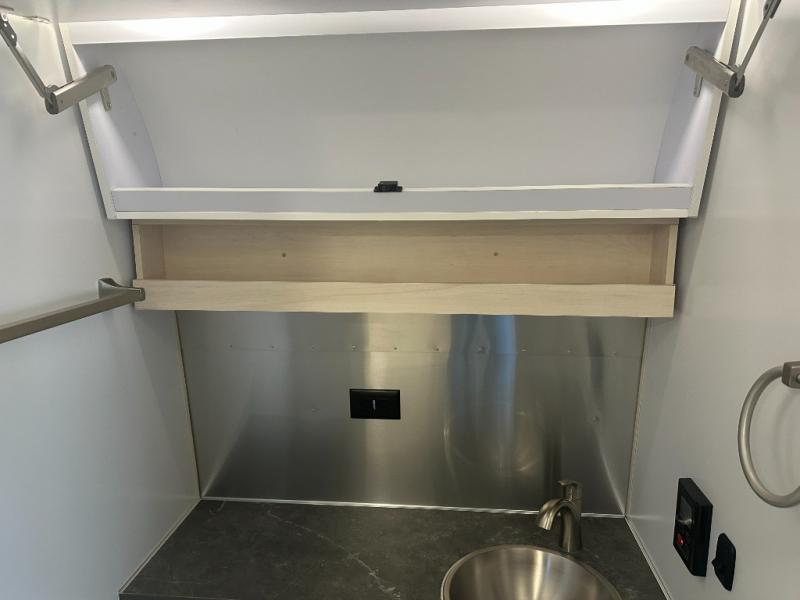 When you enjoy the finer things when traveling, this trailer will provide that for you plus lots of natural lighting and plenty of conveniences. The convertible rear dinette offers a place to dine and socialize for four, and there is a lounging area along the side with a TV on the wall. The table acts as a sturdy base below the cushions when you need some sleeping space. The front bedroom offers more panoramic windows and a comfortable queen bed or optional twin beds with a view each morning and night. You will find storage for your clothing, and a split bathroom with a private toilet and sink on one side and a shower that stands independently across the hall. And the kitchen offers everything you need to make meals including extra counter space and a refrigerator for leftovers. And there is a rear hatch option for this trailer you might want to add to let fresh air in!