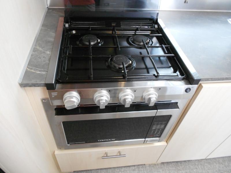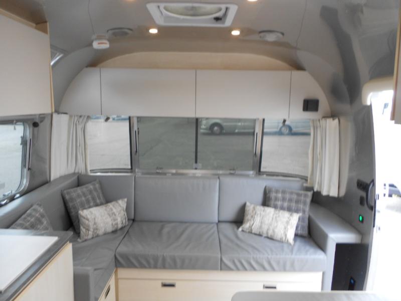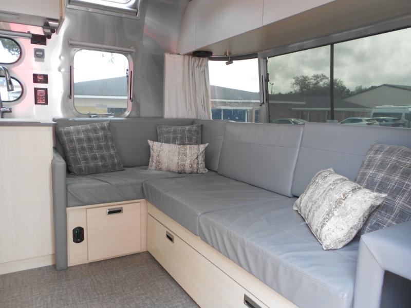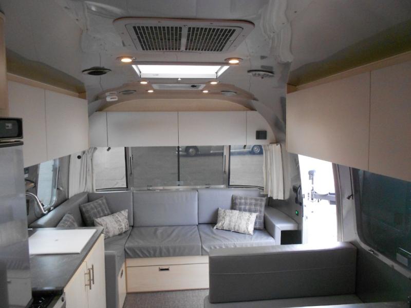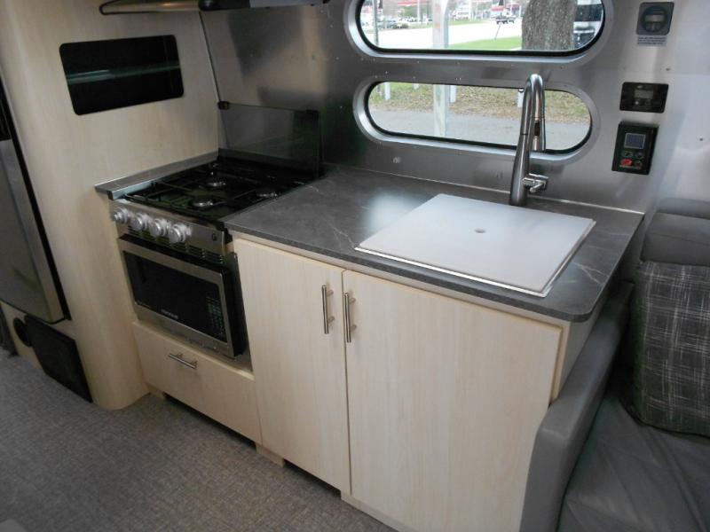 With each Flying Cloud travel trailer by Airstream, there are two axles, and each is built for ease of towing, plus there is a rear-view camera to make reversing and parking easier, and stainless steel front stone guards to protect the lower segments from road debris. The iconic Airstream design is created outside and inside by the semi-monocoque aluminum superstructure, the temperature reducing one-piece white aluminum roof, the panoramic front windows, and the stylish aluminum wheels. The interior will have you feeling right at home with handcrafted cabinetry, plenty of storage and counter space, sleek roller blinds and blackout curtains, plus residential style faucets!