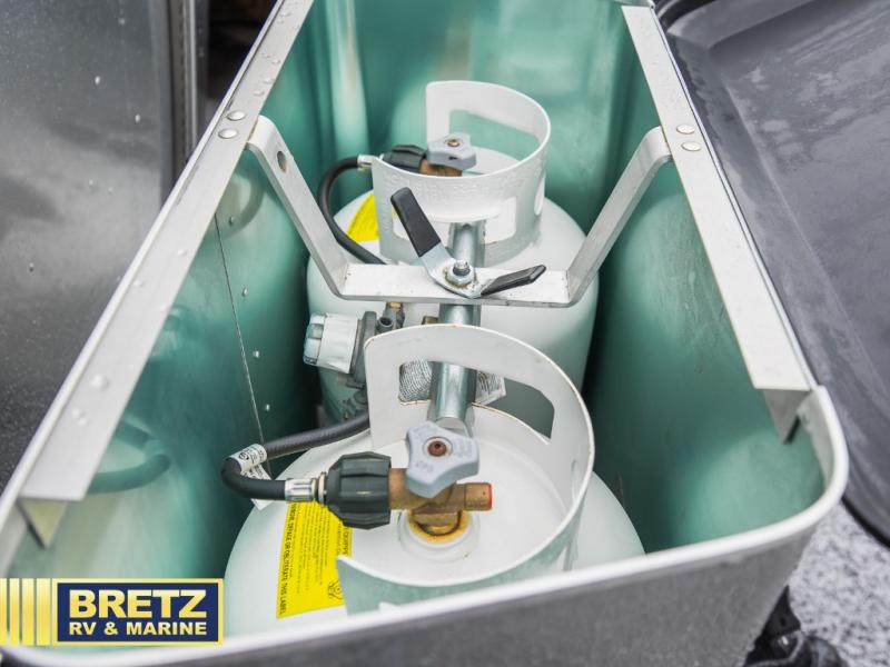Start traveling the country in true luxury with this travel trailer! It features a front wrap around lounge with stain resistant Spradling Hitch fabric that can be pulled out and the table lowered to create a 38" x 78" sleeping space. A separated bathroom makes it easy for one person to freshen up in the shower with a seat while another is across the way utilizing the private toilet and vanity. The rear queen bed has an AdaptaFlex memory foam mattress to enjoy a good night's rest, nightstands to set your glass of water, and a 24" 12V DC Smart TV to watch your favorite movie in bed. If you'd like a center aisle and longer mattresses, just choose the optional twin beds! You will find plenty of storage throughout between the upper and lower kitchen cabinets, a slide-out pantry, multifunctional storage bins that are flush to the surface behind the deep stainless steel Moen sink, under-the-bed storage, and a closet to hang your clothes.