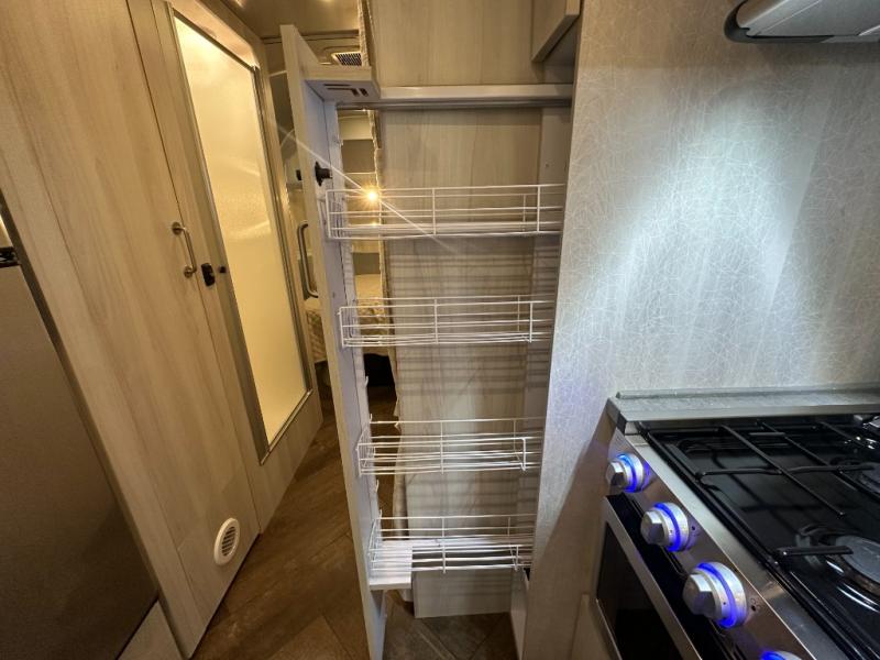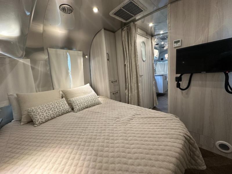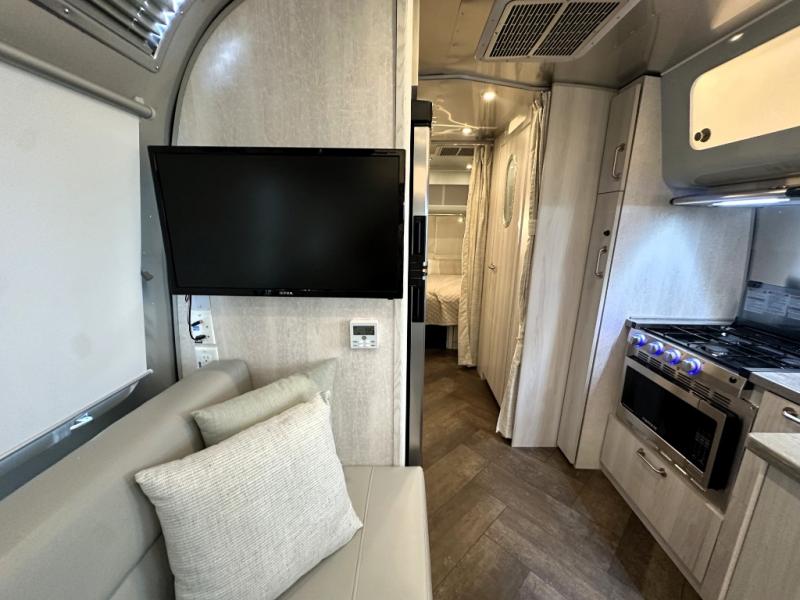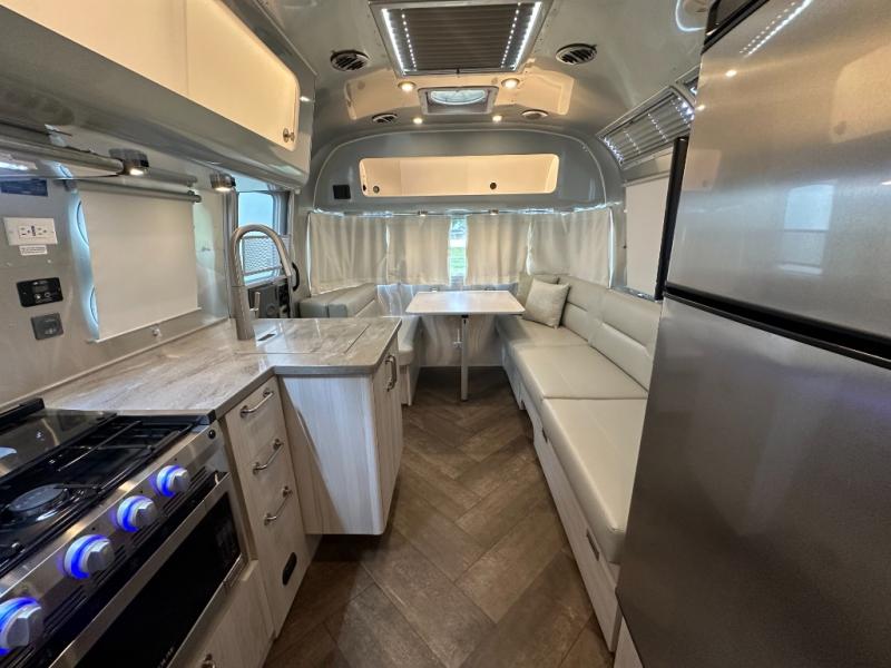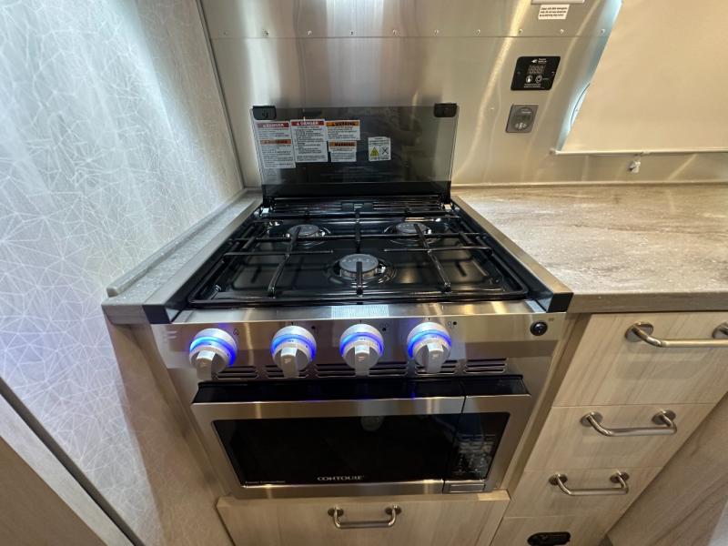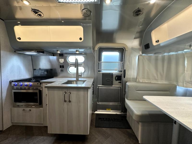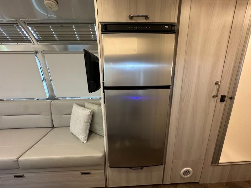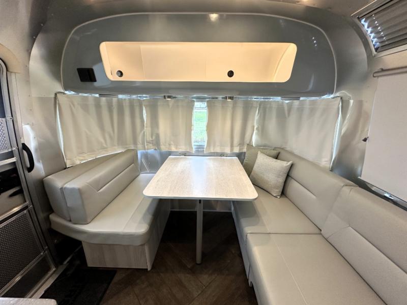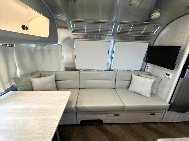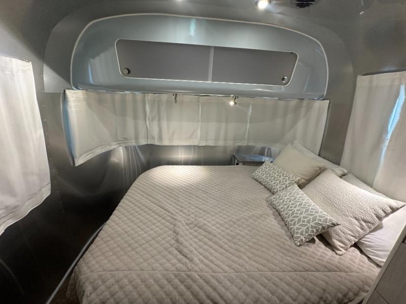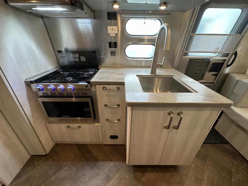Every time you step foot into the Airstream International travel trailer, you will feel as if you are breathing in a breath of fresh air! The fresh coastal décor was inspired by the waterfront, and the stylish interior delivers a relaxing environment and comfortable luxury. The panoramic windows increase the amount of natural sunlight that streams through to the interior, but they also have blackout shades that you can close whenever you need a darkened room. The beautiful handcrafted Italian Lite-Ply laminated cabinetry is an attractive base for the overhead storage lockers that have sliding doors and LED lighting. The dimmable interior LED lighting will create the perfect amount of illumination for you as you spend time indoors. The exterior has excellent features as well with its enclosed aluminum insulated heated underbelly, unique front door key with heavy-duty deadbolt, optional solar package, solar front window protection, and exterior shower with hot and cold water.