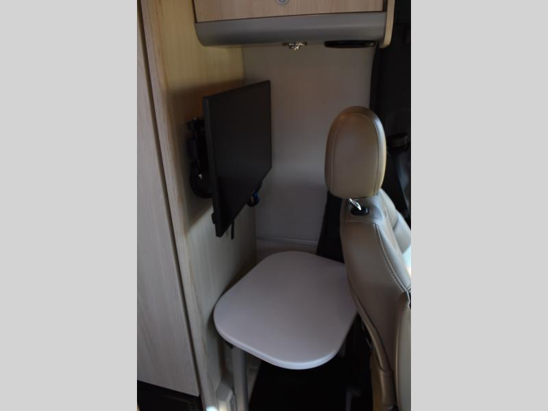 Get ready to drive and stay in comfort and luxury in this motorhome with everything you need and everything you didn't even know you wanted! The driver and passenger seats swivel to face the interior living space allowing you to utilize the Corian countertop with an LED TV above to place your beverages and the driver can work from here if needed once stopped. Whip up a meal using the galley kitchen featuring a two-burner gas stove, and a large stainless steel sink and faucet, plus extra counter space for food prep. There is a 1.2 cu. ft. drawer microwave and deep drawers for storage, plus a slide-out pantry and a refrigerator with a freezer across from the sink. The power sofa in the rear can be fully flat with a push of a button so two can sleep or rest. And there is storage throughout for your hanging clothes, towels, luggage, dishes and more.