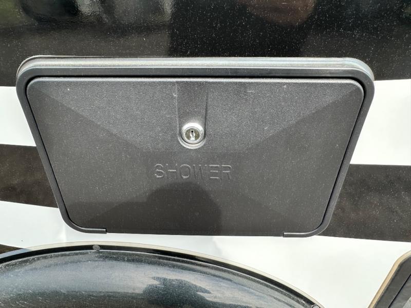 This cute little travel trailer is perfect for two who enjoy the outdoors, but don't need the frills, and just want a dry place to sleep and call home base. Enter at the back to find a 3 cu. ft. 3-way refrigerator/freezer, flush mount sink and a two burner LP cooktop. Across from the kitchen amenities, you'll find a convenient hidden swivel cassette toilet for easy nighttime restroom breaks. The opposing dinette seats with a table between converts to create a 77" x 72" bed at night, and there is lift up storage in front. You will appreciate the outside shower to wash off hiking gear or freshen up and there is also an LP connection and dual tanks with a cover.