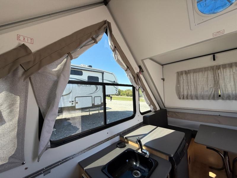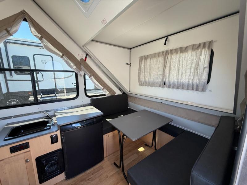 Pack your bags and be on the road in no-time with this lightweight A-frame camper that can sleep three people. You'll enjoy having a 56" x 76" permanent bed with storage underneath for your shoes or bags, and if you have a guest sleep over, they can sleep on the dinette that converts to a 46" x 76" bed. Whip up a hearty lunch on the two burner in/out stove, or use the convenient microwave oven. There is also a 3.0 cu. ft. 2-way refrigerator for perishables and additional storage space for dry goods.