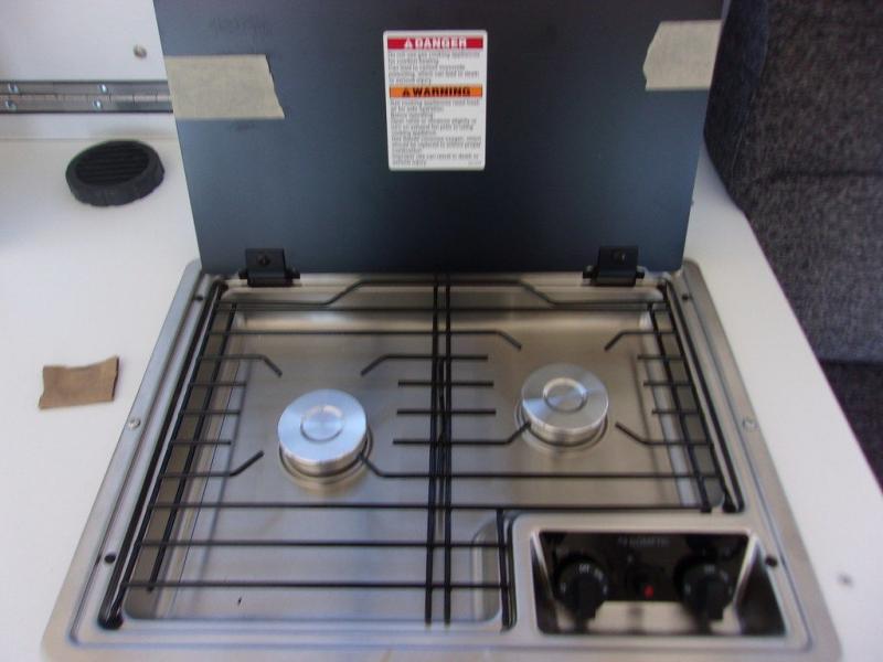 Don't wait another minute; head to the campground in this camper today! There is a two burner cooktop to make lunch on and a 3.0 cu. ft. 3-way refrigerator with a freezer for your cold items, and you can add the optional outside grill if you like to cook outdoors! The sofa bed converts to a queen-size bed and the dinette also converts to a queen-size bed or dual bunks. You'll find storage space under the dinette and on the two shelves, and there is a 32" x 32" hidden shower under the dinette so you can clean up each day. This model also has a dry weight of 2,400 lbs. for easy towing!