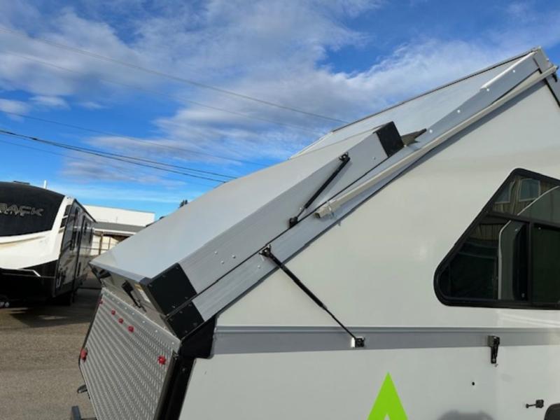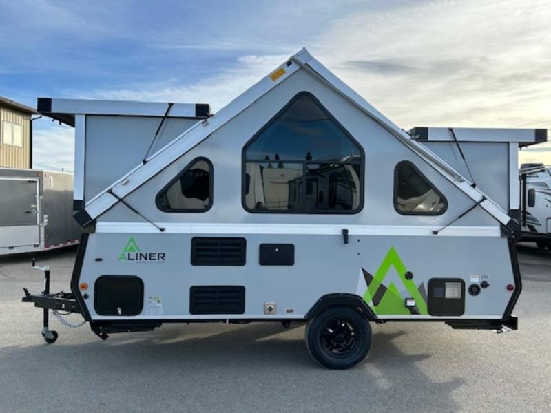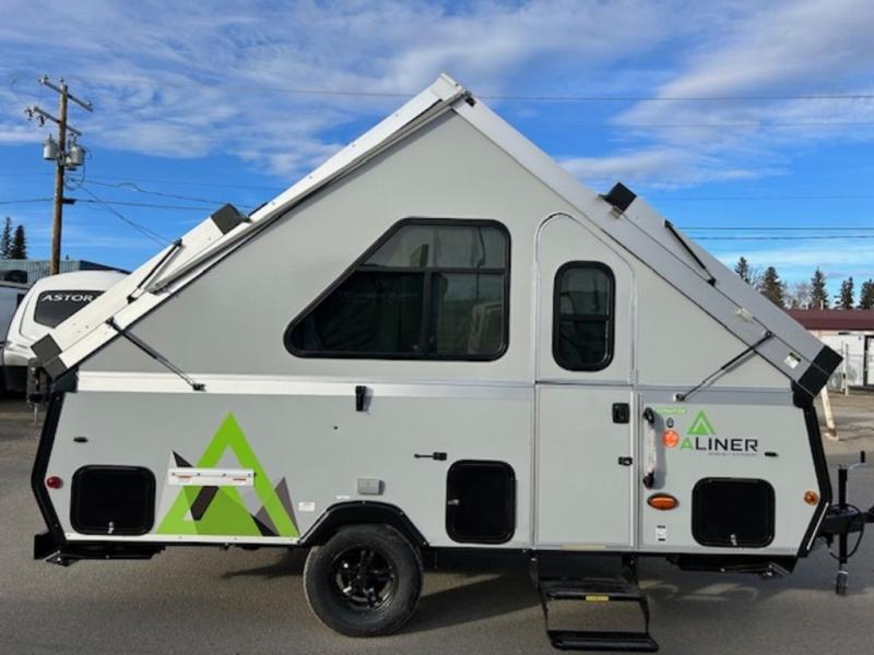 With any Expedition A-frame campers by Aliner, the construction includes a tubular steel frame that is E-coated with a powder coating on the front tongue and bumper, an Azdel lightweight, thermoplastic composite interior wall and ceiling panels, plus Performax 500 premium marine grade flooring for durability. Some extra features include high wind lift assist, additional corner windows with panoramic views, and a command A/C heat pump. Inside, there are high density foam, hypoallergenic cushions, a refrigerator with a freezer, a swivel cassette toilet, and a microwave. You will also appreciate three interior electrical outlets to keep the electronics charged and two skylights with night shades. There are available options to enhance your Expedition such as adding more interior head room with a front or rear hard dormer and/or a rear soft or hard dormer, plus you have the choice to add an outside grill.