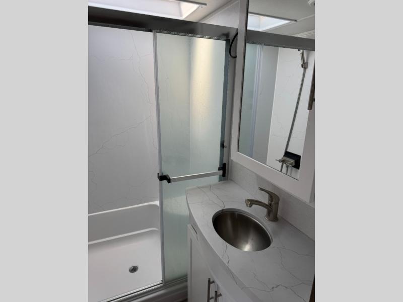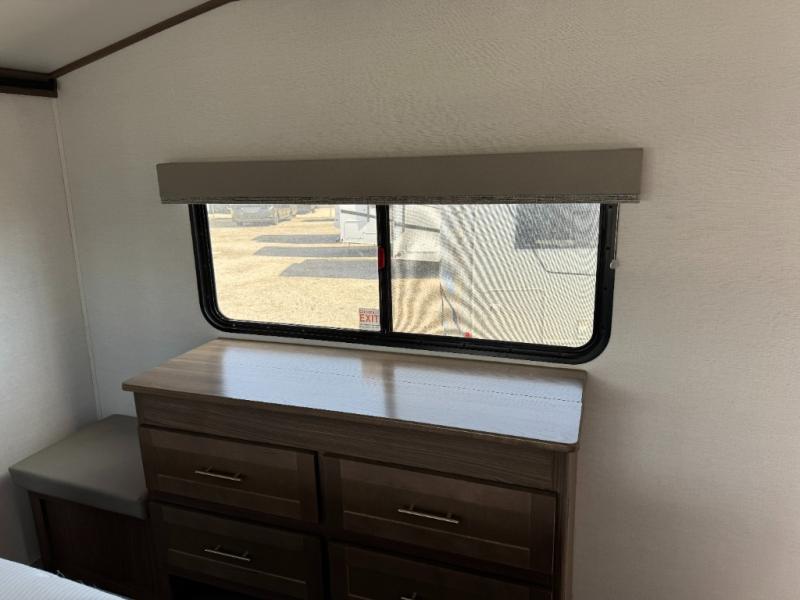 A benchmark chassis creates a space saver upper deck with each one of these Avenue fifth wheels by Alliance RV! The 101 in. wide-body construction gives you more room to walk around and the flush slide out floors throughout prevent any tripping. There are Azdel composite sidewalls inside and out, and a seamless fully walkable PVC roof for extreme durability, zero maintenance, and it is more solar reflective because of the bright white color. Twin 13,500 BTU A/C units provide 27,000 BTUs of cooling power which are ultra quiet and independently controlled keeping you comfortable during your entire trip. And, the fully enclosed and heated underbelly means that you can extend your camping season into the colder months if you like. You are sure to love the "no carpet zone" making each Avenue easy to clean and allergen free, not to mention pet friendly with vinyl flooring throughout. And, strategically placed Atrium windows in the bedroom and living area will not only provide more light, cross ventilation and fresh air, but bring a spectacular view of your surroundings right inside. You can maximize your space throughout with innovative storage solutions like the hidden storage behind the TV, inside the end tables, ottoman, and dinette chairs. Come choose your favorite model today!