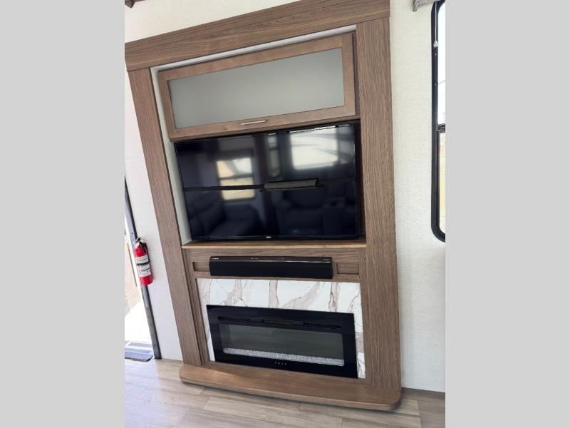 If you've been on the search for a luxury fifth wheel, this is the one! You'll love the rear kitchen with ample counter space, a 16 cu. ft. 12V refrigerator, plus a large sink to clean up. The swing-mount 50" HDTV will provide entertainment for your family while you relax on the dual recliner theater seat or tri-fold sofa. Freshening up each day will be a breeze in the full bath that includes a shower with a seat, and the front private bedroom is close by for convenience. You'll have the queen bed all to yourselves with an option to choose a king bed instead. And check out the large front closet with washer and dryer prep. Going full-time has never been easier!