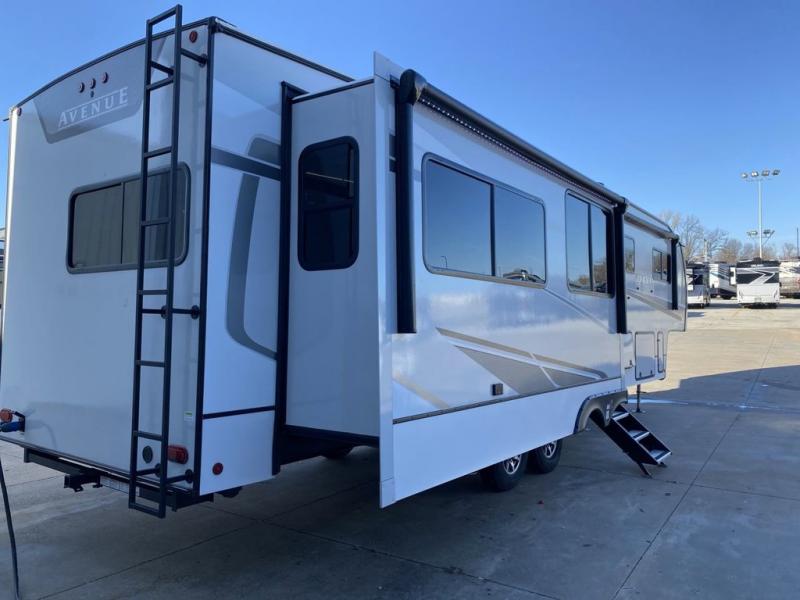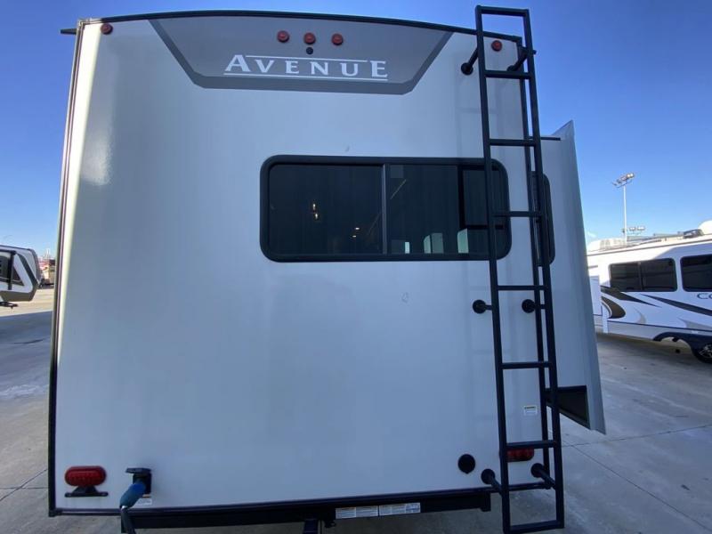 A benchmark chassis creates a space saver upper deck with each one of these Avenue fifth wheels by Alliance RV! The 101 in. wide-body construction gives you more room to walk around and the flush slide out floors throughout prevent any tripping. There are Azdel composite sidewalls inside and out, and a seamless fully walkable PVC roof for extreme durability, zero maintenance, and it is more solar reflective because of the bright white color. Twin 13,500 BTU A/C units provide 27,000 BTUs of cooling power which are ultra quiet and independently controlled keeping you comfortable during your entire trip. And, the fully enclosed and heated underbelly means that you can extend your camping season into the colder months if you like. You are sure to love the "no carpet zone" making each Avenue easy to clean and allergen free, not to mention pet friendly with vinyl flooring throughout. And, strategically placed Atrium windows in the bedroom and living area will not only provide more light, cross ventilation and fresh air, but bring a spectacular view of your surroundings right inside. You can maximize your space throughout with innovative storage solutions like the hidden storage behind the TV, inside the end tables, ottoman, and dinette chairs. Come choose your favorite model today!