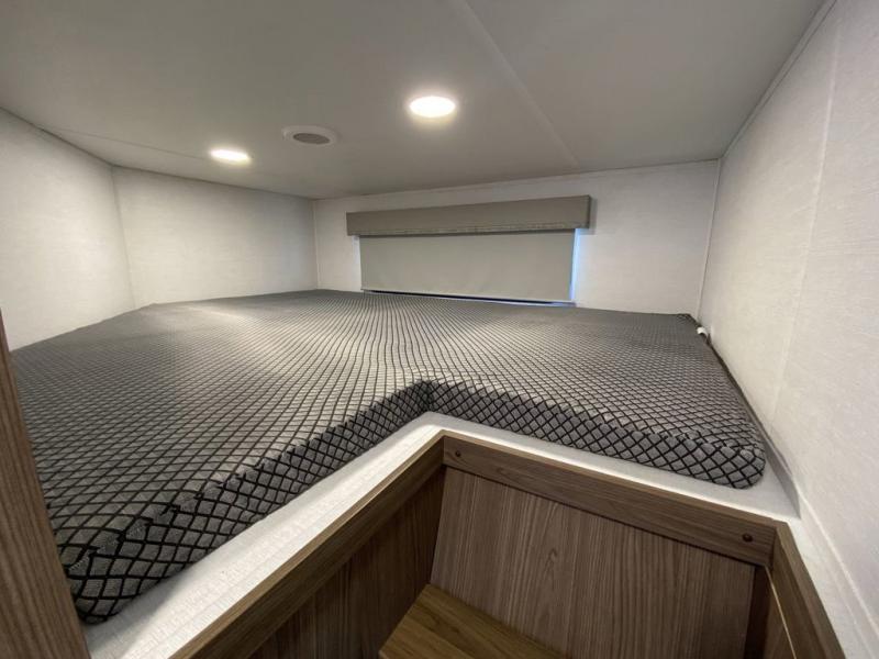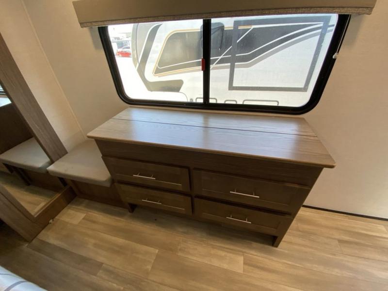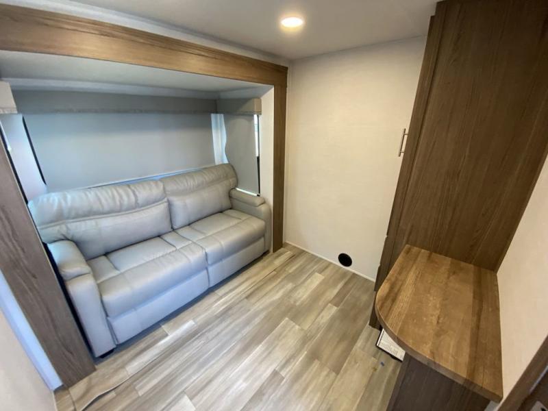 This fifth wheel is packed full with comfortable features! The front private bedroom has a queen bed slide that can be switched out for an optional king bed, a dresser, and a front wardrobe that is prepped to add an optional washer and dryer. Freshen up each morning in the full bathroom with a 30" x 50" shower then head to the full kitchen to prepare breakfast using the kitchen island and three burner cooktop. The second bedroom has a sofa slide with a loft above it all accessible from a staircase at the top of the steps up to the front master bedroom and bath, right before the bathroom door on your left. Relax each night on the dual recliner theater seating across from the swing mount 50" HDTV with hidden storage behind it, or play a few games at the U-shaped dinette. This model also has the option to switch out the U-shaped dinette for an optional floating dinette table beside the theater seat. You also have an outside refrigerator and outside griddle by a flip-up baggage door for storage!