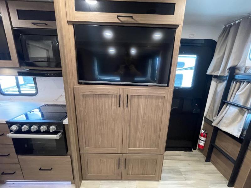 Sleeping for eight is easy in this new Delta travel trailer with a set of 46" x 75" rear corner bunks, a queen bed in the front private bedroom, and a U-shaped dinette. The front bedroom features plenty of storage with large overhead cabinets as well as within bedside wardrobes and nightstands for your personal items. You can easily prepare all of your favorite meals and snacks with the kitchen amenities provided. A three burner range allows you to easy cook indoors, or you can enjoy cooking outside using the outdoor griddle/grill if you like. There is a 10 cu. ft. 12V refrigerator to keep all of your perishables and drinks nice and cold, plus a large sink for dishes and cleaning up, as well as a pull-out trash can and flip-up counter extension. You will also appreciate the rear corner bath featuring a 30" x 36" shower, vanity with sink, and soft close porcelain toilet with foot flush.