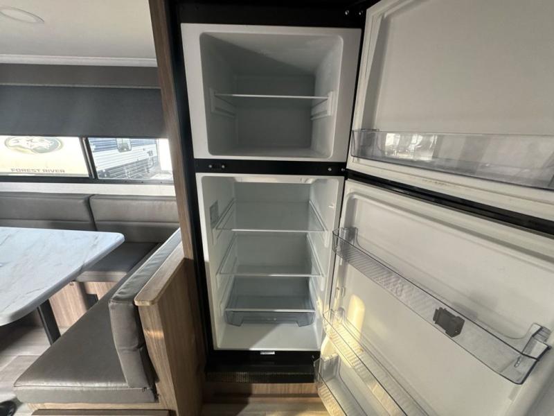Sleeping for eight is easy in this new Delta travel trailer with a set of 46" x 75" rear corner bunks, a queen bed in the front private bedroom, and a U-shaped dinette. The front bedroom features plenty of storage with large overhead cabinets as well as within bedside wardrobes and nightstands for your personal items. You can easily prepare all of your favorite meals and snacks with the kitchen amenities provided. A three burner range allows you to easy cook indoors, or you can enjoy cooking outside using the outdoor griddle/grill if you like. There is a 10 cu. ft. 12V refrigerator to keep all of your perishables and drinks nice and cold, plus a large sink for dishes and cleaning up, as well as a pull-out trash can and flip-up counter extension. You will also appreciate the rear corner bath featuring a 30" x 36" shower, vanity with sink, and soft close porcelain toilet with foot flush.