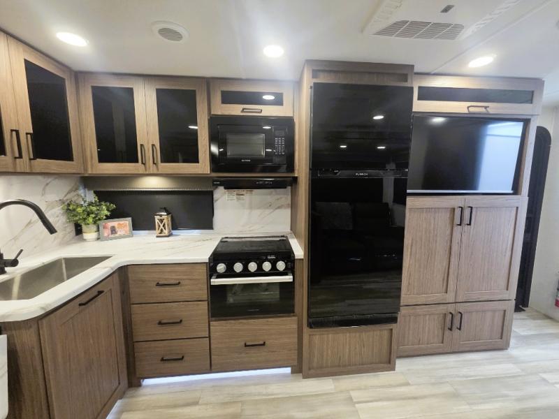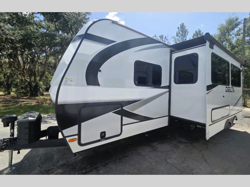 You will love all of your adventures with this Delta travel trailer in tow! This unit is perfect for a couple or even a family of four or six with a queen bed in the front private bedroom, and also using the sofa and U-shaped dinette once converted for more sleeping space. The U-shaped dinette is great for gathering for meals, a board game or game of cards, and the sofa is directly opposite a 40" HDTV which makes viewing enjoyable. You can easily prepare all of your favorite meals and snacks with the kitchen amenities provided inside. A three burner range allows you to easily cook indoors, or you can cook outside using the outdoor griddle/grill if you like. There is a 10 cu. ft. 12V refrigerator to keep all of your perishables and drinks nice and cold, plus a large sink for dishes and cleaning up, and a convenient pull-out trash can and flip-up counter extension as well. You will also appreciate the full rear bath featuring a 30" x 36" shower, toilet, vanity with sink, and linen cabinet for your towels and toiletries.