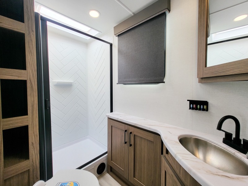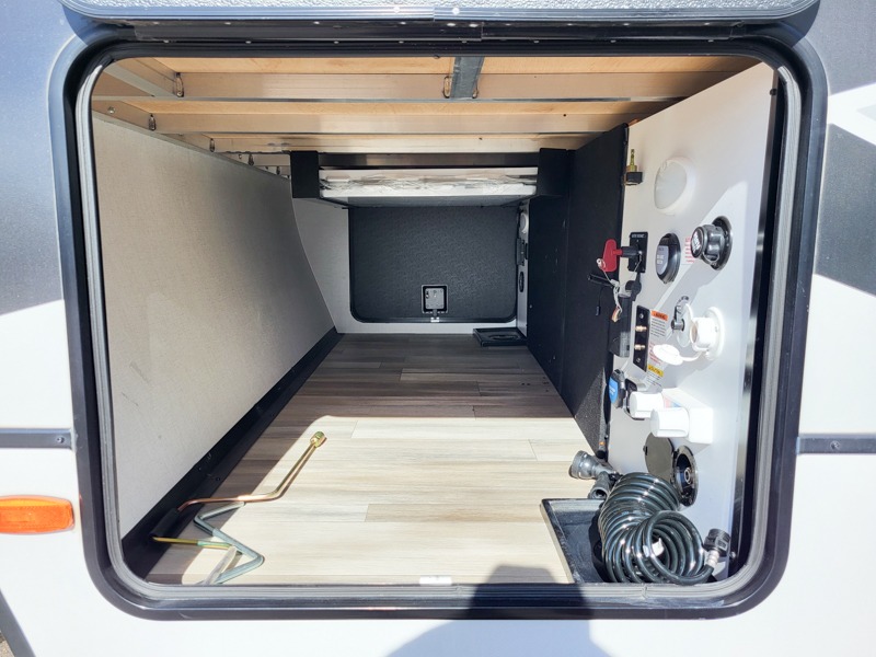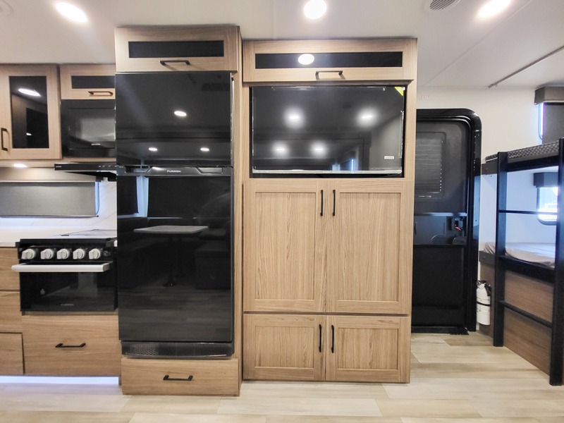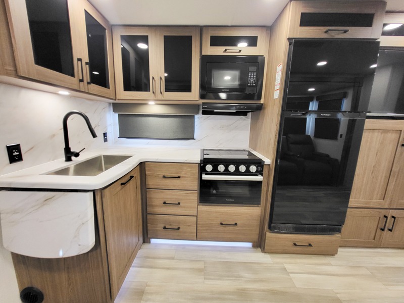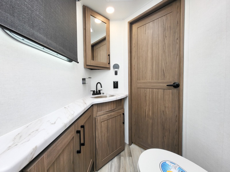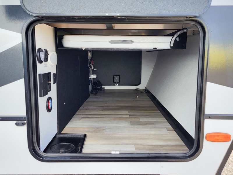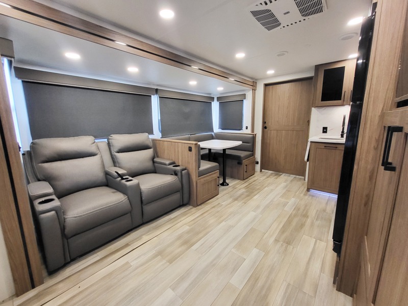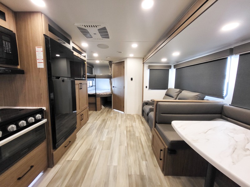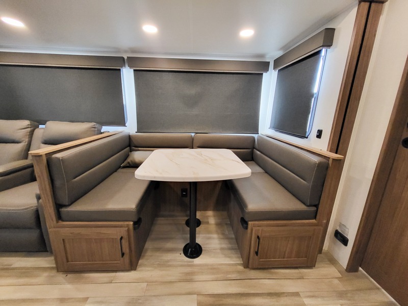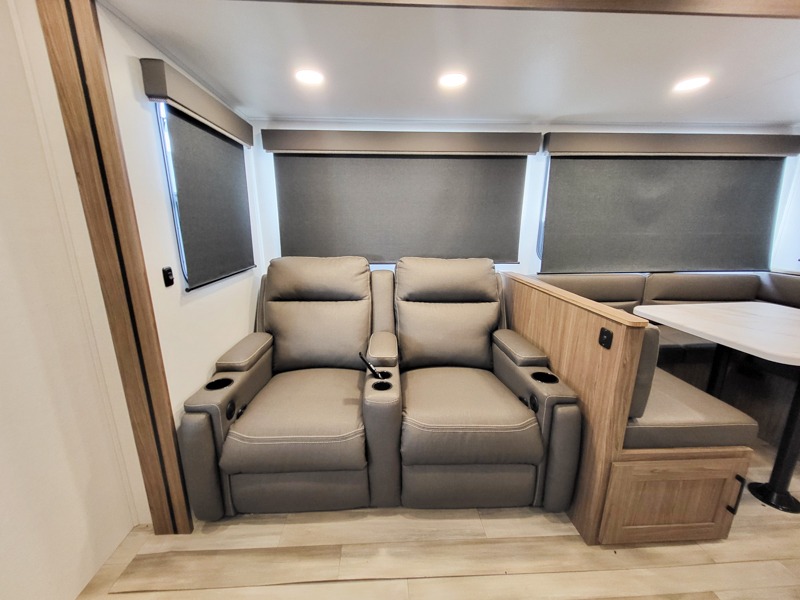 The perfect travel trailer for a larger family or one that enjoys traveling with friends! One large slide opens up the interior living space nice and features a U-shaped dinette and theater seating to provide plenty of seating for everyone. Enjoy the 40" HDTV opposite the seating for a movie indoors, and game night will be easy with everyone at the dinette which can also be converted for added sleeping if needed. The double entry doors will make loading and unloading simple, and allows you to easily slip in and out of the private bedroom for a morning walk. \You can easily prepare all of your favorite meals and snacks with the kitchen amenities provided inside. A three burner range allows you to easily cook indoors, or you can enjoy cooking outside using the outdoor griddle/grill if you like. There is a 10 cu. ft. 12V refrigerator to keep all of your perishables and drinks nice and cold, plus a large sink for dishes and cleaning up, and there is also a flip-up counter extension for more prep space. You will also appreciate the rear corner bath featuring a 30" x 36" shower, vanity with sink, soft close porcelain toilet with foot flush, and linen cabinet for your towels.