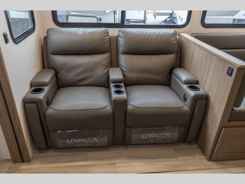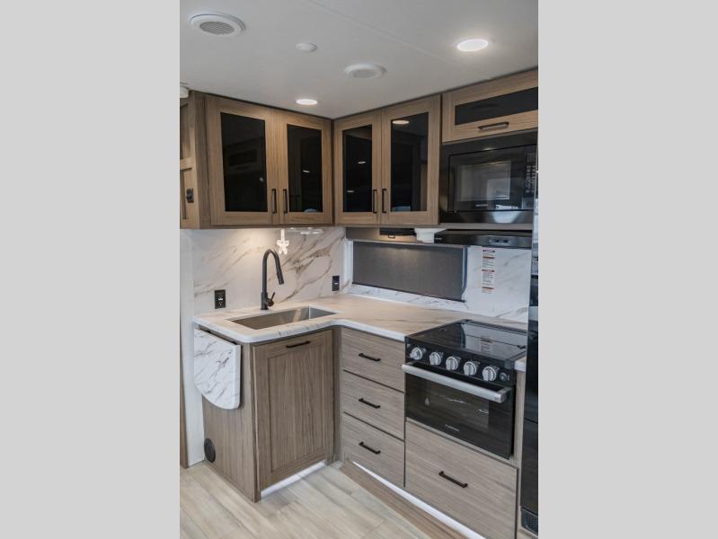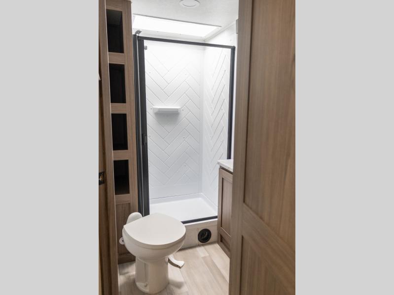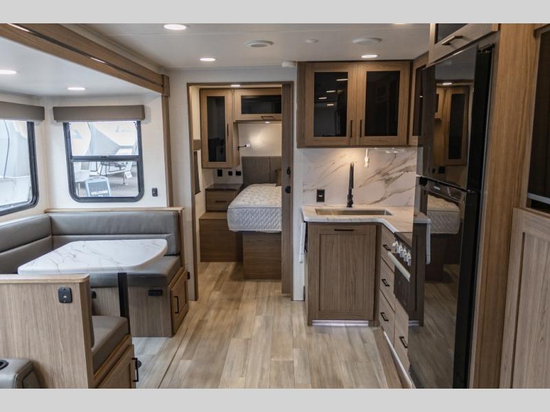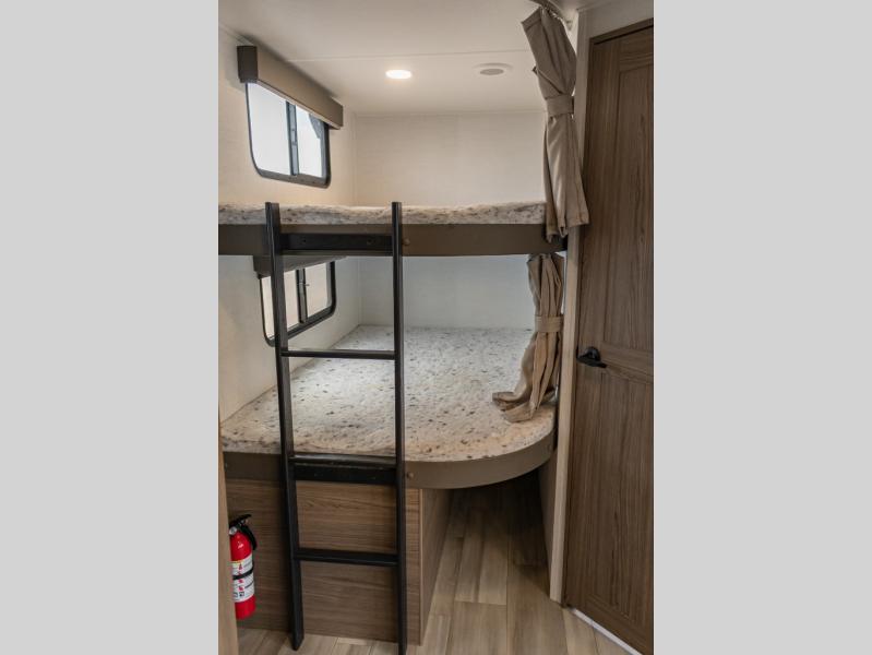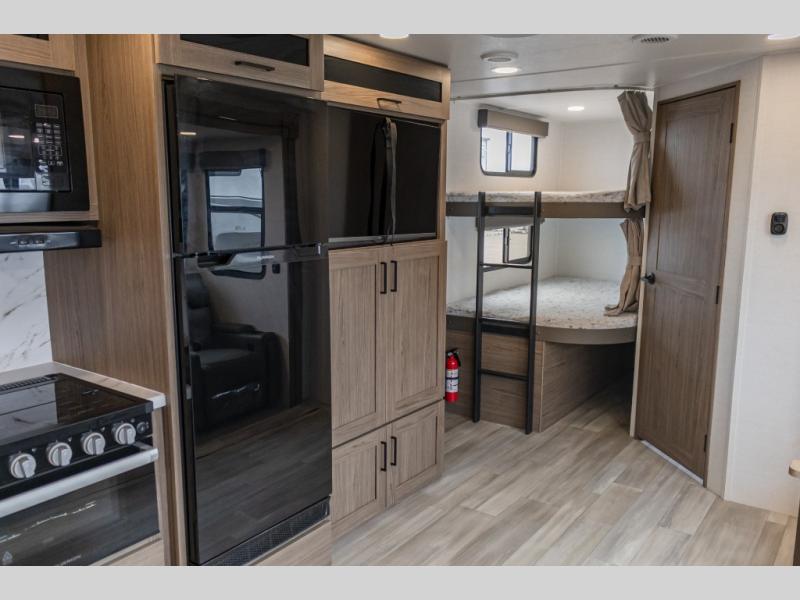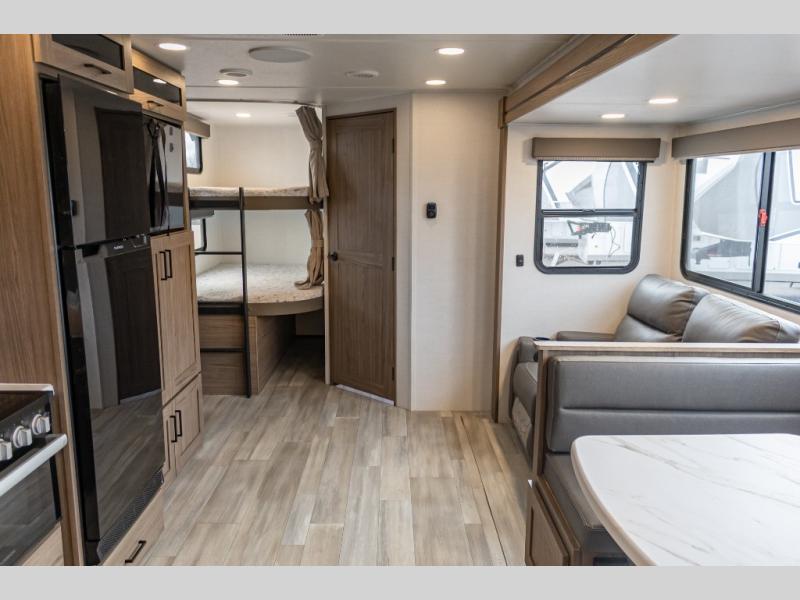 The perfect travel trailer for a larger family or one that enjoys traveling with friends! One large slide opens up the interior living space nice and features a U-shaped dinette and theater seating to provide plenty of seating for everyone. Enjoy the 40" HDTV opposite the seating for a movie indoors, and game night will be easy with everyone at the dinette which can also be converted for added sleeping if needed. The double entry doors will make loading and unloading simple, and allows you to easily slip in and out of the private bedroom for a morning walk. \You can easily prepare all of your favorite meals and snacks with the kitchen amenities provided inside. A three burner range allows you to easily cook indoors, or you can enjoy cooking outside using the outdoor griddle/grill if you like. There is a 10 cu. ft. 12V refrigerator to keep all of your perishables and drinks nice and cold, plus a large sink for dishes and cleaning up, and there is also a flip-up counter extension for more prep space. You will also appreciate the rear corner bath featuring a 30" x 36" shower, vanity with sink, soft close porcelain toilet with foot flush, and linen cabinet for your towels.